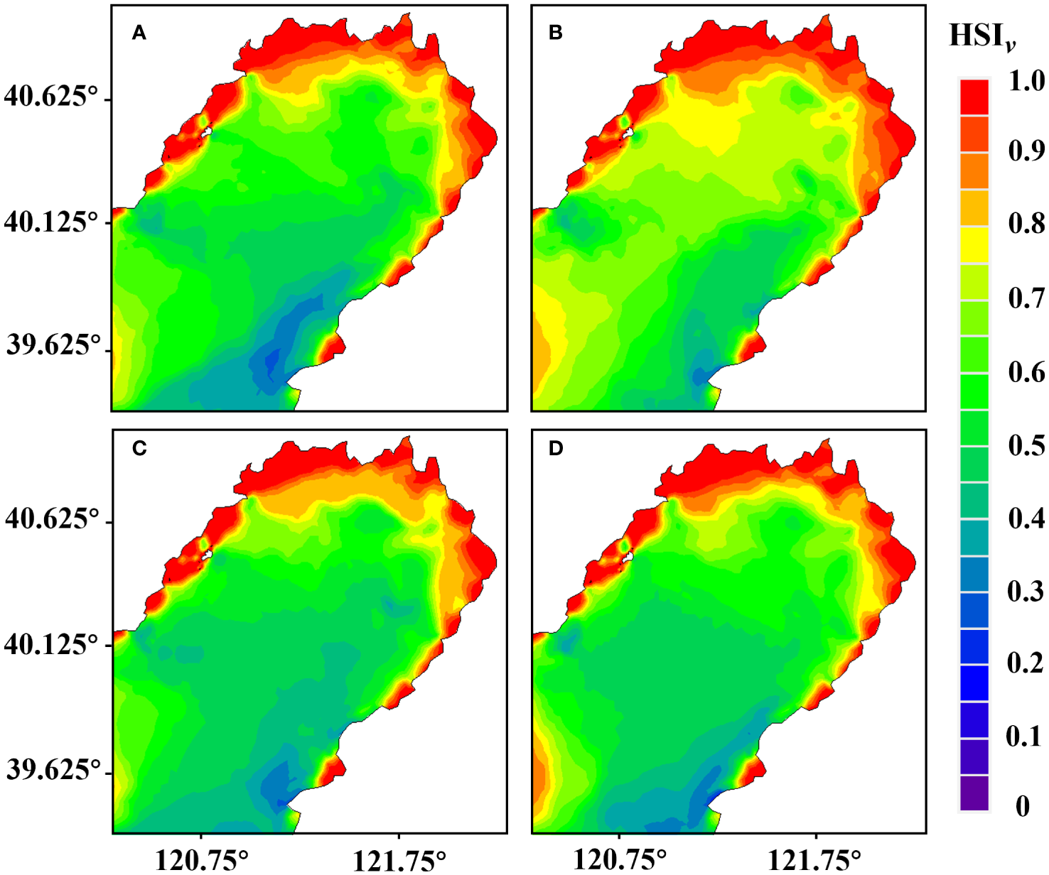 Distribution of the habitat suitability index for flow velocity () during various periods in the Liaodong Bay. (A) Early June. (B) Late June. (C) Early July. (D) Late July.