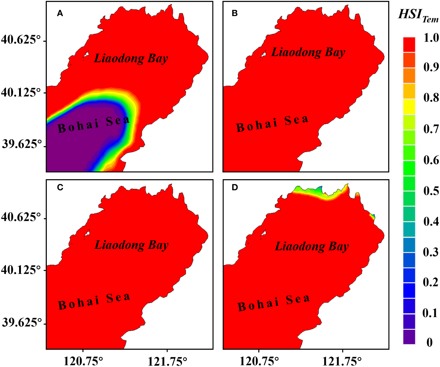 Distribution of the habitat suitability index for water temperature () during various periods in the Liaodong Bay. (A) Early June. (B) Late June. (C) Early July. (D) Late July.