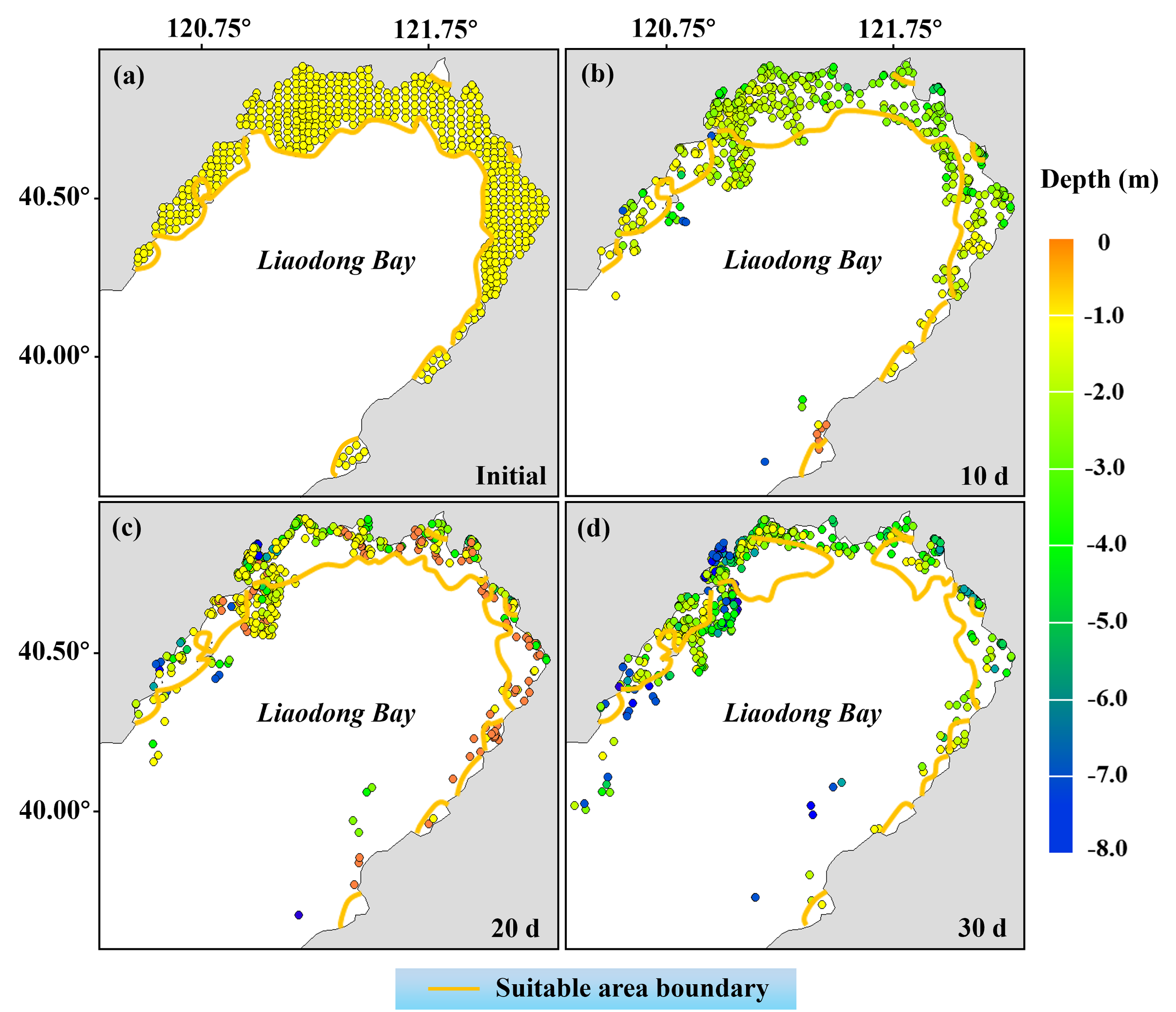 We utilized a particle tracking model to assess the migration characteristics of larvae and the likelihood of their persistence within suitable habitats during a specified duration following their release.
