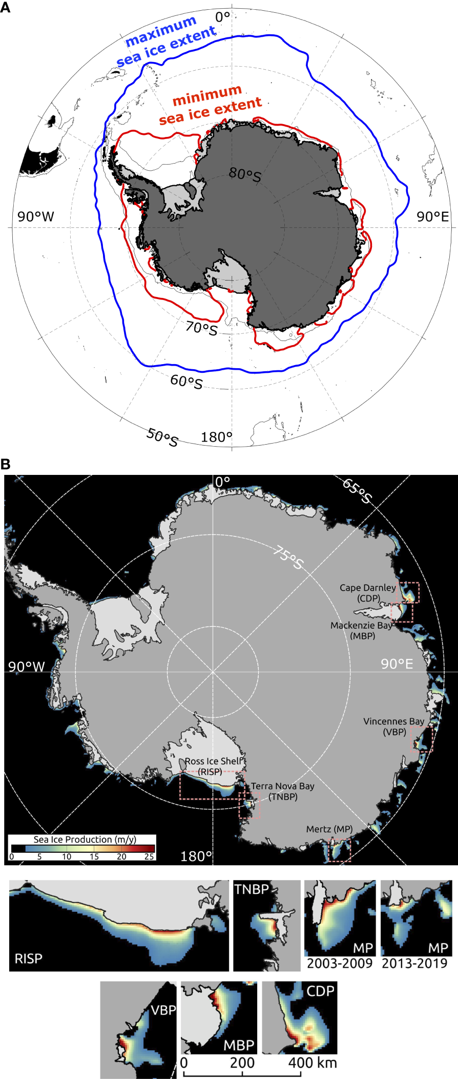 Maps showing Antarctic sea ice coverage and production. (A) Map of summer minimum (February, red line) and winter maximum (September, blue line) Antarctic sea ice extent (defined by the 15% sea ice concentration threshold from the 1978–2018 climatological sea ice values; Meier et al., 2017). (B) Map of annual sea ice production (m/year) during the freezing period (March–October) averaged over the period 2003–2019, updated by Nakata et al. (2021). The lower panels are close-up maps for the polynyas (red dashed rectangles in the main panel) that can create Antarctic Bottom Water (AABW) dense precursors.