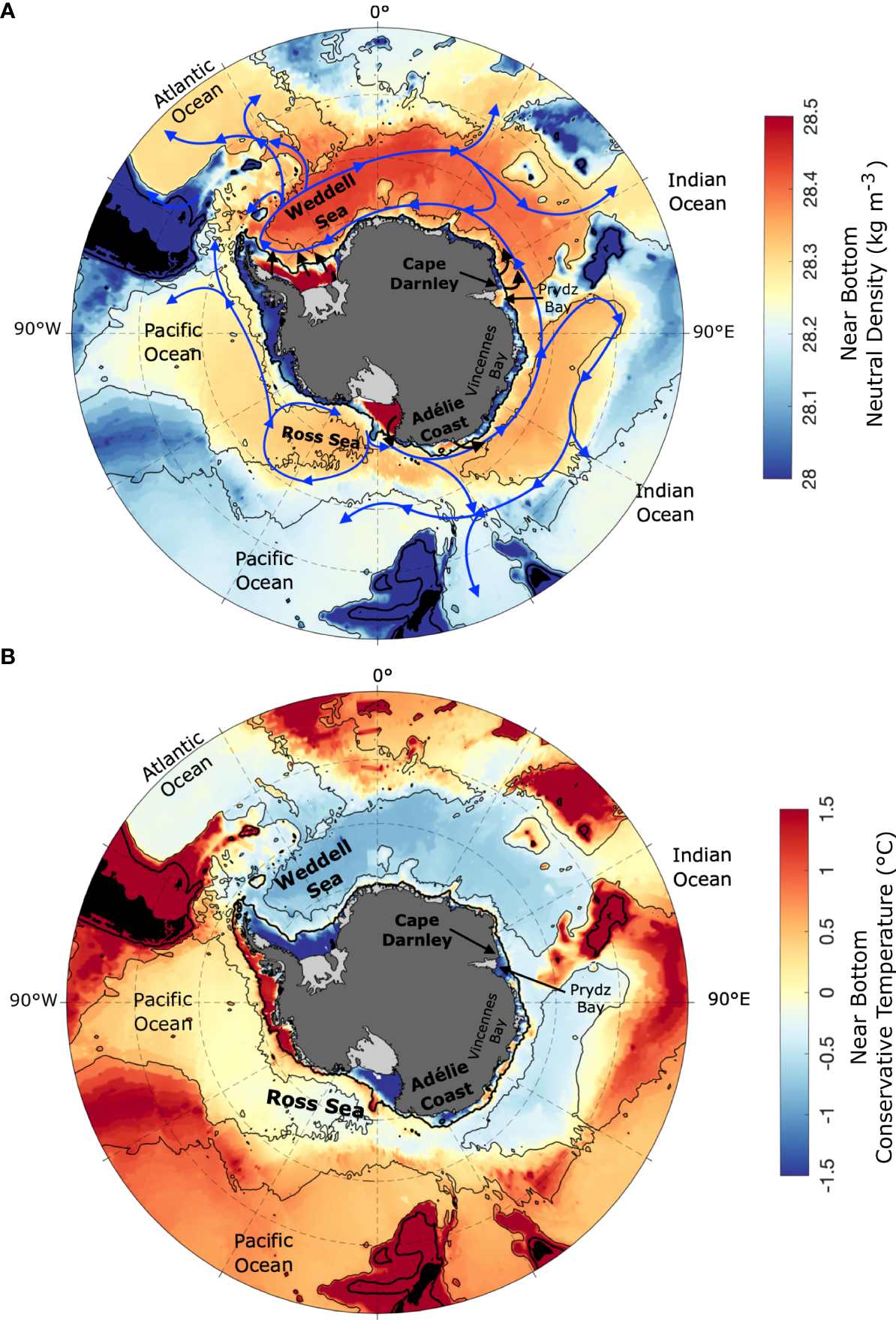Maps of Antarctic Bottom Water (AABW) properties and spreading in the Southern Ocean. Climatological near bottom (A) neutral density (kg/m3) and (B) conservative temperature (°C) derived from the World Ocean Experiment (WOCE; Gouretski and Koltermann, 2004). AABW formation regions are highlighted in (A) by black arrows, while blue arrows show the main pathways of AABW through the Southern Ocean (from Orsi et al., 1999; Talley, 2013; Van Sebille et al., 2013; Purkey et al., 2018; Solodoch et al., 2022). AABW and its precursor DSW are characterized by dense (red in panel A) and cold (blue in panel B) water properties near the seafloor. The 1,000-m isobath is in thick black and roughly delimits the continental shelf, while the 4,000-m isobath is in thin black (Gouretski and Koltermann, 2004). The Antarctic coastline is from BedMachine (Morlighem et al., 2020).