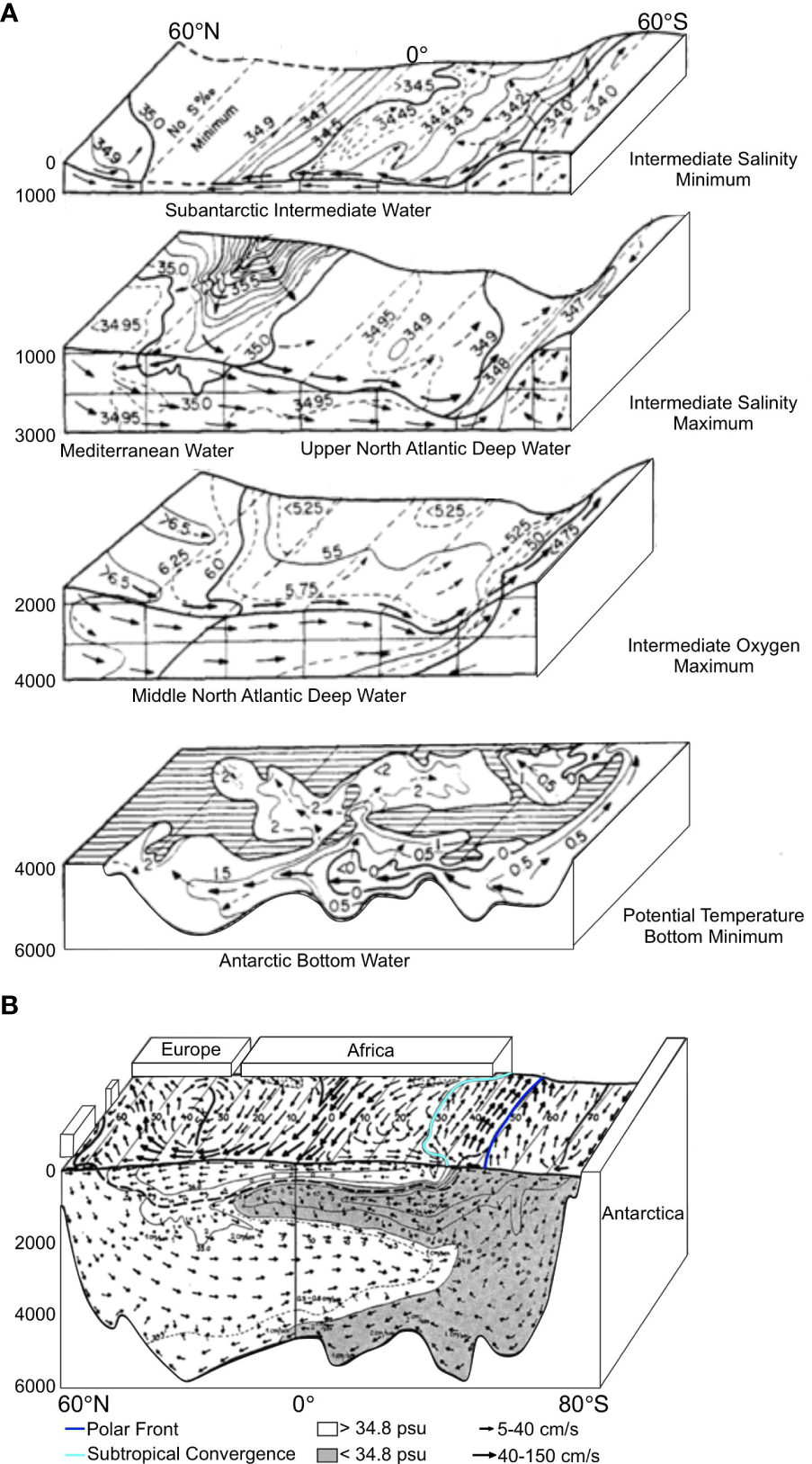 Schematic diagrams showing meridional spreading of water mass in the Atlantic Ocean. (A) Spreading of main water masses of the Atlantic Ocean in four core layers adapted from Wüst, 1964. (B) Surface currents, salinity contours, and the meridional circulation along a section in the western Atlantic by Wüst (1935); Wüst (1949). Small numbers are geostrophic speeds in cm/s. Dashed line is the 9°C boundary between warm and cold layers. Polar Front and Subtropical Convergence are depicted as blue and cyan lines, respectively. Adapted from Richardson (2008).