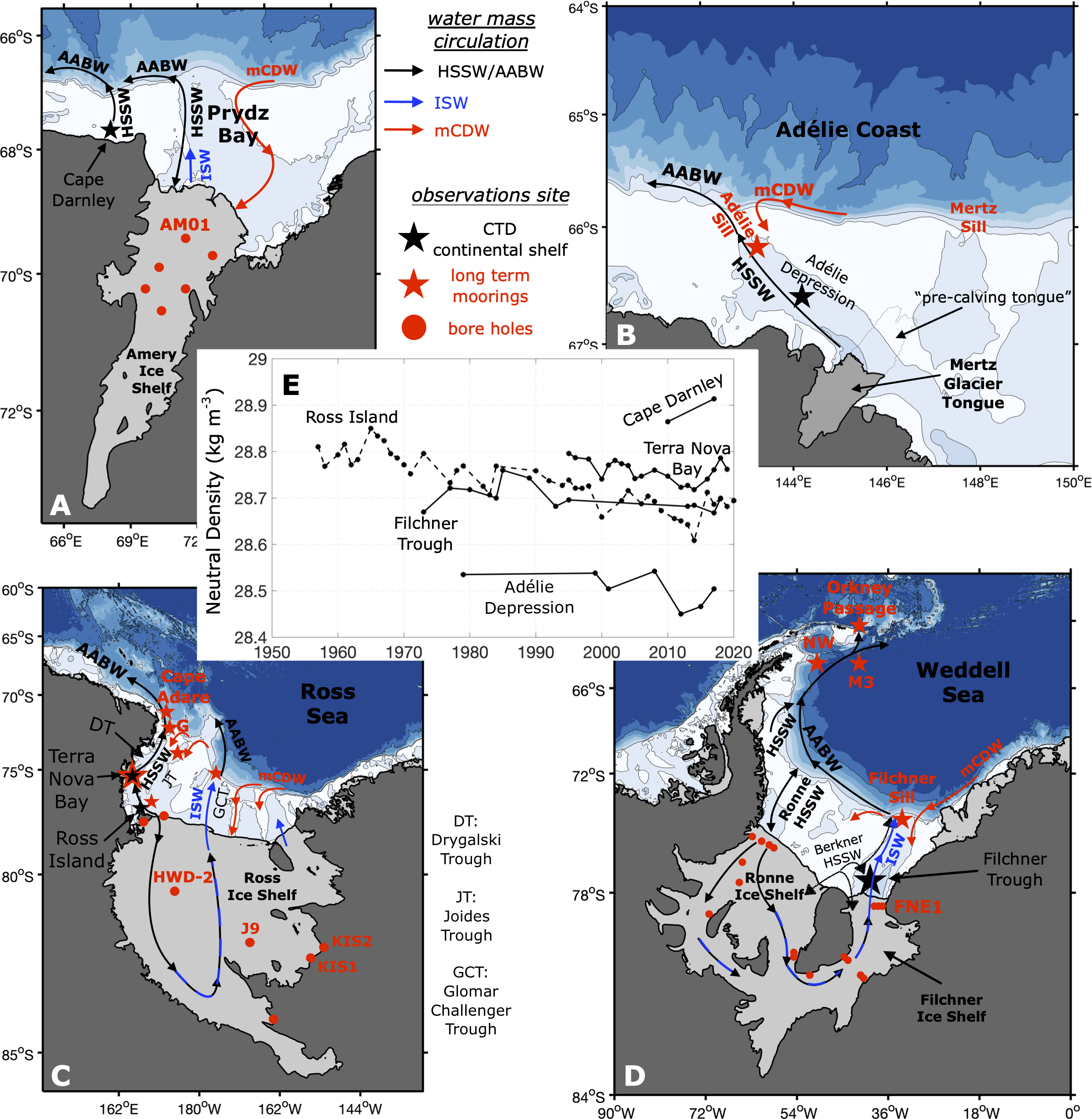 Maps showing circulation in (A) Prydz Bay, (B) Adélie Coast, (C) Ross Sea, and (D) Weddell Sea (D). Circulation of water masses and locations of oceanographic measurements are depicted by arrows, dots, and stars (according to the legend). (E) Time series of neutral density (kg/m3) observed near the seafloor in the main areas of high-salinity shelf water (HSSW)/Ice Shelf Water (ISW) sourcing Antarctic Bottom Water (AABW). mCDW refers to modified Circumpolar Deep Water. From lighter to denser: Adélie Depression (location is indicated by the black star in panel B), Filchner Trough (black star in panel D), Terra Nova Bay/Ross Island (black stars in panel C), and Cape Darnley (black star in panel A).