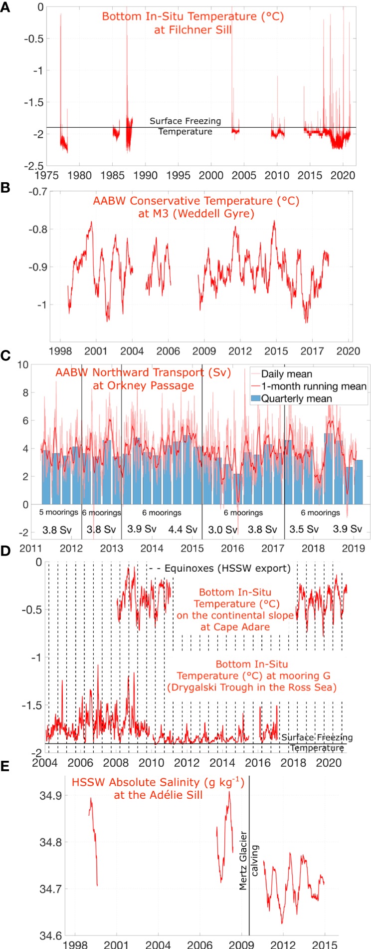 Temporal variability of Antarctic Bottom Water (AABW) properties from long-term mooring data. (A)In situ temperature (°C) observed near the seafloor at ~550 m depth at the Filchner Sill, Weddell Sea. Surface freezing temperature for a salinity of 34.7 g/kg is shown in solid black for reference. (B) AABW conservative temperature (°C) measured at ~4,500 m depth along the northern limb of the Weddell Gyre (M3 in Figure 5D). (C) Northward transport (106 m3/s; Sverdrup (Sv)) of AABW through Orkney Passage (Abrahamsen et al., 2019; Spingys et al., 2021; AABW defined here in the density class 28.26< γn< 28.40 kg/m3). The light red line indicates daily averages of transport through the mooring array, the thick red line is the 1-month running mean, and the blue bars are quarterly averages. Vertical black lines indicate mooring cruises to the area; the annual (April 1–March 31) mean AABW transport through the array is indicated at the bottom of the graph. (D)In situ temperature observed near the seafloor at ~ 500 m depth at mooring G in the Drygalski Trough and at Cape Adare (both in the Ross Sea near the shelf break and on the continental slope, respectively). Weak tides during equinoxes (dashed black lines) allow cold high-salinity shelf water (HSSW) to be exported from the shelf break (Bowen et al., 2023). Surface freezing temperature for a salinity of 34.9 g/kg is shown in solid black for reference. (E) HSSW absolute salinity (g/kg) at the Adélie Sill observed near the seafloor at ~600 m depth. Black line indicates the calving time of the Mertz Glacier Tongue (February 2010), after which HSSW salinity showed a decline (Snow et al., 2018). Locations of all moorings are shown in Figure 5 by red stars.