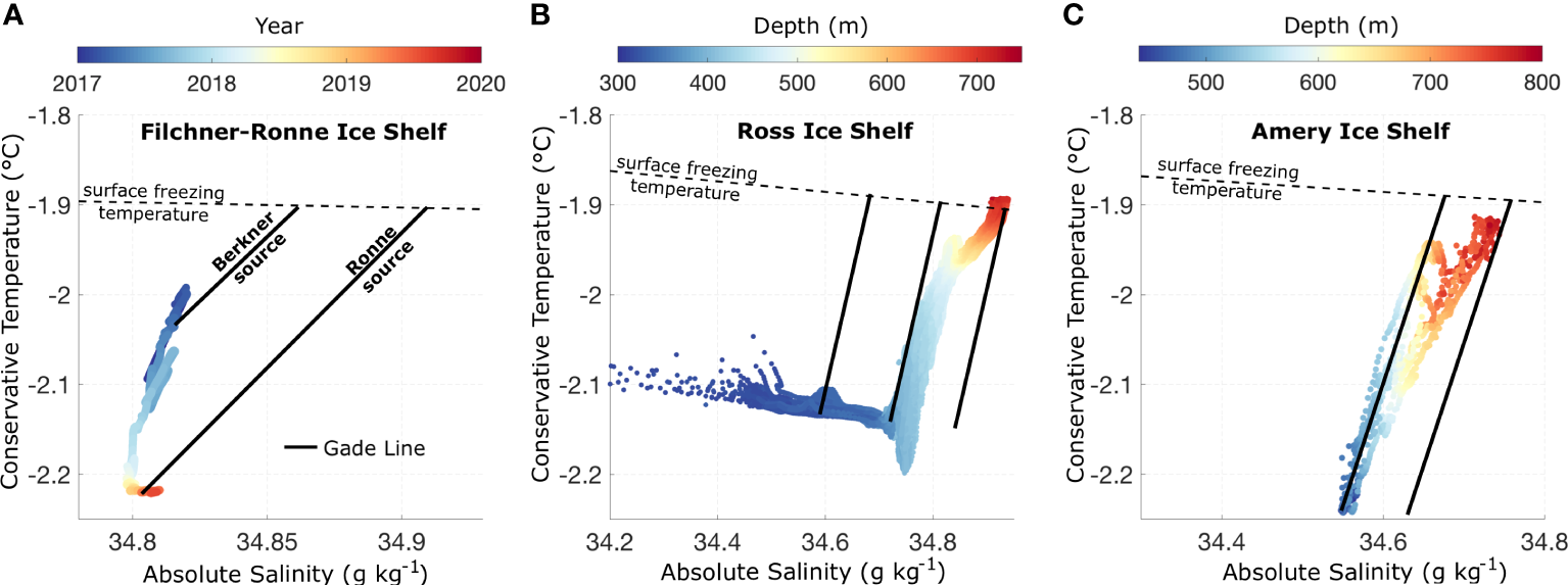 Variability of Ice Shelf Water (ISW) properties from data collected under ice shelves. (A) Conservative temperature (°C)–absolute salinity (g/kg) diagram for the Filchner-Ronne Ice Shelf cavity at FNE1 at the lowest instrument (960 m depth; Hattermann et al., 2021), color-coded according to the time of measurements. Between 2017 and 2019, ISW transitioned from Berkner to Ronne source as highlighted by the Gade Line (i.e., the mixing line between ISW properties and ISW source at the surface freezing temperature; Gade, 1979). (B) Conservative temperature–absolute salinity plot for the Ross Ice Shelf cavity at HWD-2, color-coded according to depth (m) (Stevens et al., 2020). By extrapolating the Gade Line from the ISW properties to the surface freezing temperature, we can infer that different sources with different salinity (range >0.2 g/kg) can drive melting. (C) Conservative temperature–absolute salinity diagram in the cavity of the Amery Ice Shelf at AM01, color-coded according to depth (Herraiz-Borreguero et al., 2013). The ISW source is water with salinity between approximately 34.65 and 34.75 g/kg. Locations of all sites are shown in Figure 5. The dashed black line represents the surface freezing temperature according to salinity.