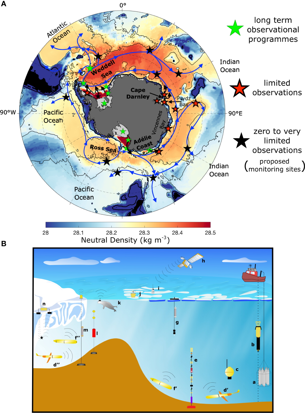 Marine mammals, in particular Elephant (Southern Mirounga leonina) and Weddell (Leptonychotes weddellii) seals, equipped with biological and physical electronic sensors, such as CTD instruments (Nicholls et al., 2008; Roquet et al., 2013), have provided unique observations in the Southern Ocean (see McMahon et al. (2021) for a full discussion). Seals have the ability to dive to the seafloor (up to ~2,000 m depth for elephant seals) and under sea ice, providing year-round observations in regions hard to reach (such as the Antarctic continental shelf; see Figure 11B), especially in the winter months. Temperature and salinity profiles collected by seals have delivered new insights into the formation of dense waters on the Antarctic continental shelf (e.g., Nicholls et al., 2008; Ohshima et al., 2013; Kitade et al., 2014; Williams et al., 2016; Portela et al., 2021). These data have highlighted factors limiting dense water formation, including intrusions of warm CDW onto the shelf (Ribeiro et al., 2021; Herraiz-Borreguero and Naveira Garabato, 2022) and glacial meltwater input from melting ice shelves (Williams et al., 2016; Silvano et al., 2018; Ribeiro et al., 2021).