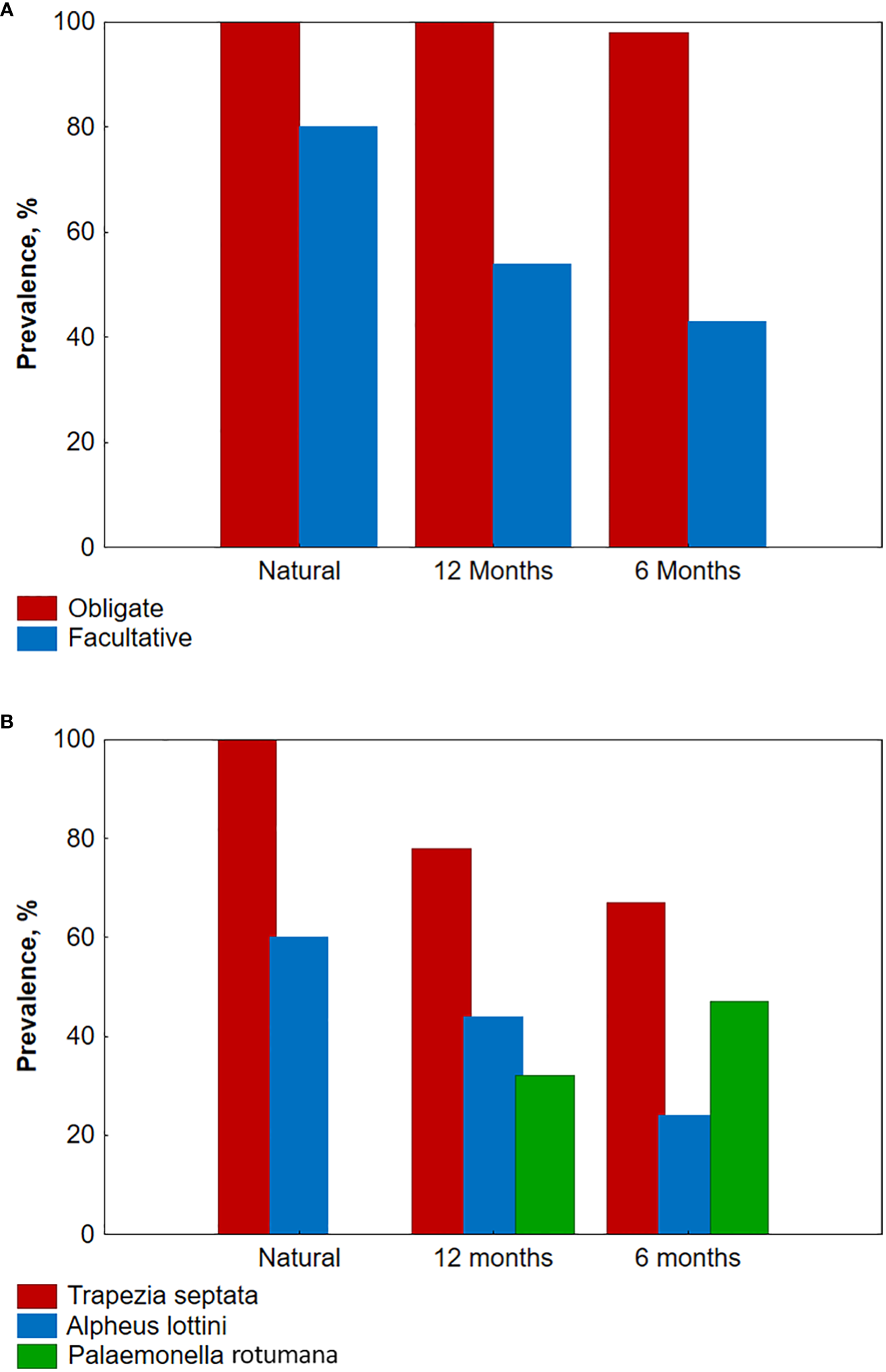 All coral colonies were found to be populated by obligate ectosymbionts, resulting in 100% prevalence, while the prevalence for facultative ones was lower at 80.0% and 53.7% for natural and reared colonies with 12-month exposure, respectively (Figure 5A).