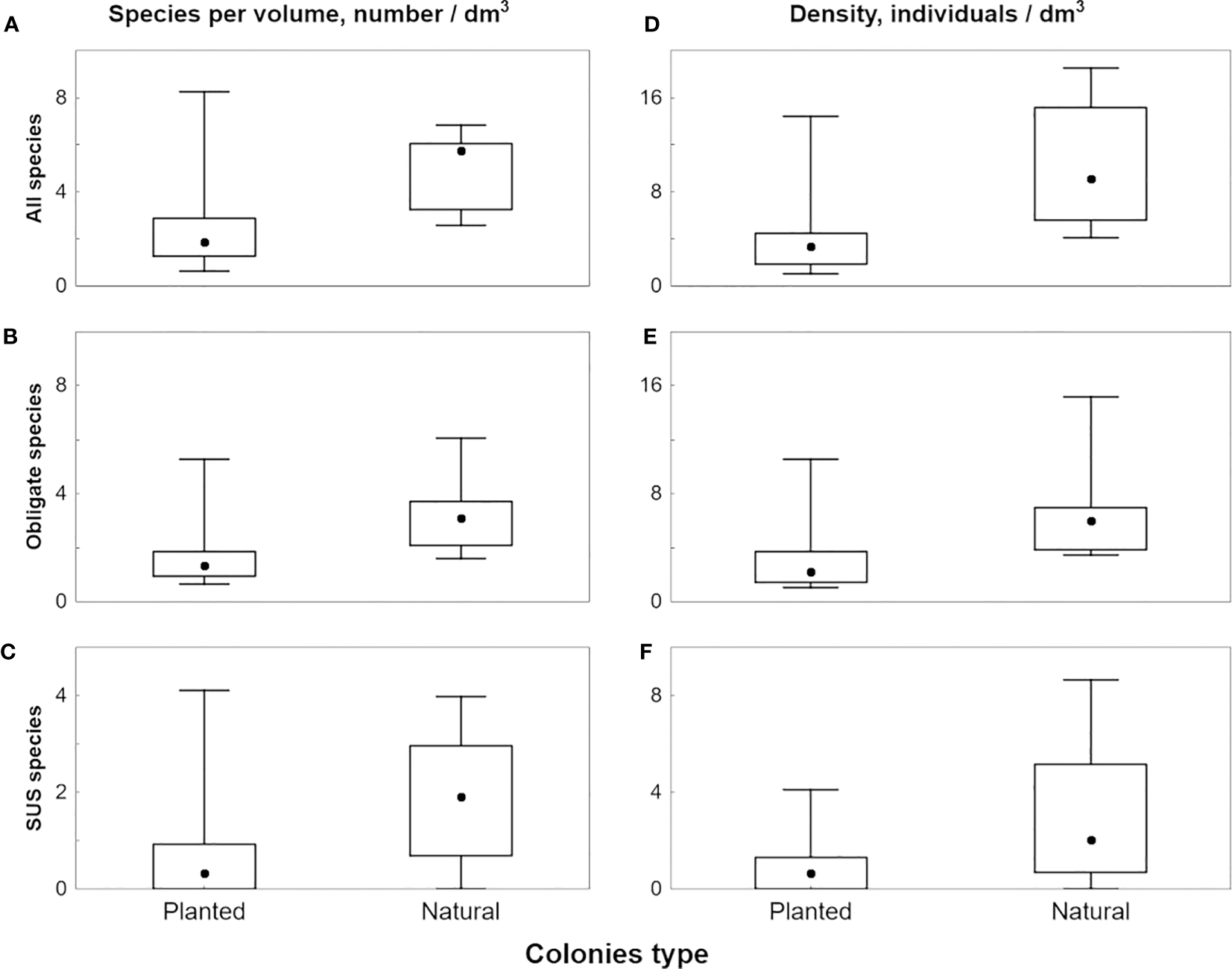 The diversity (total number of obligate and facultative species), species richness (median number of species per 1 dm3 of colony volume of infested hosts), density (median number of individuals per 1 dm3 of colony volume of infested hosts), and prevalence (ratio between number of infested and total number of hosts) were compared between communities associated with planted and natural coral colonies. Typically, when comparing symbiotic communities, species richness and average abundance are calculated per host (Bush et al., 1997). However, to adjust for the correlation between the number of associated species and their abundance with the volume of the coral colony (Abele and Patton, 1976; Austin et al., 1980), the number of species and individuals per 1 dm3 were calculated instead of per colony (Britayev and Mikheev, 2013). Therefore, we used a more accurate term “density” instead of “average abundance”. These terms were employed with minor changes following Bush et al. (1997). The assemblage formed by all ectosymbionts from different species harbored by the same host individual is known as an infracommunity, while all infracommunities from a target host population are considered as the component community (Holmes and Price, 1986).