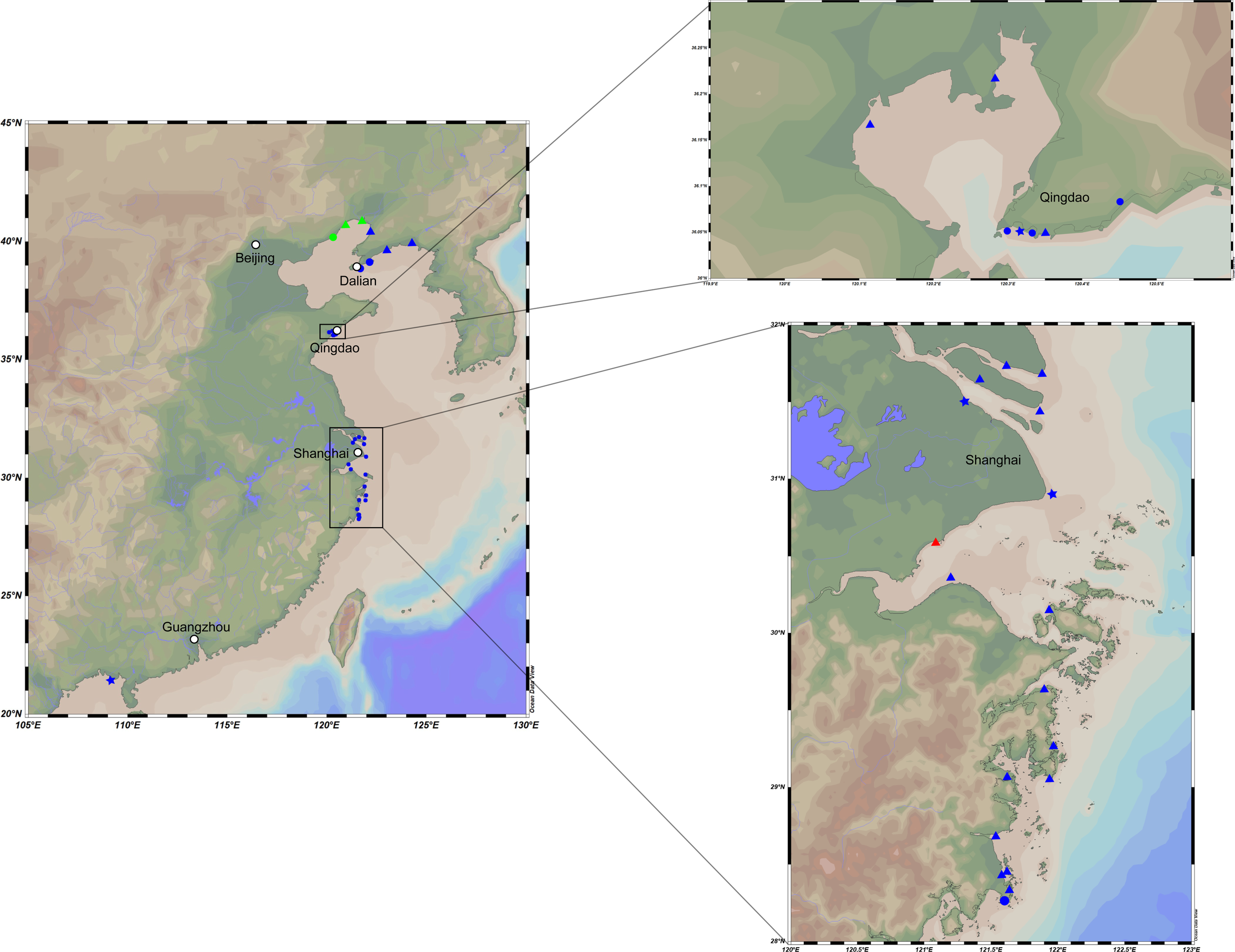 Map representing locations of the intertidal sediment sampling stations. Dots in these plots represent different substrate types and sample depths. Triangle, mud flat; circle, sand flat; star, muddy sand flat. Blue, 0–5-cm depth; red, 5–15-cm depth; green, 15–25-cm depth.
