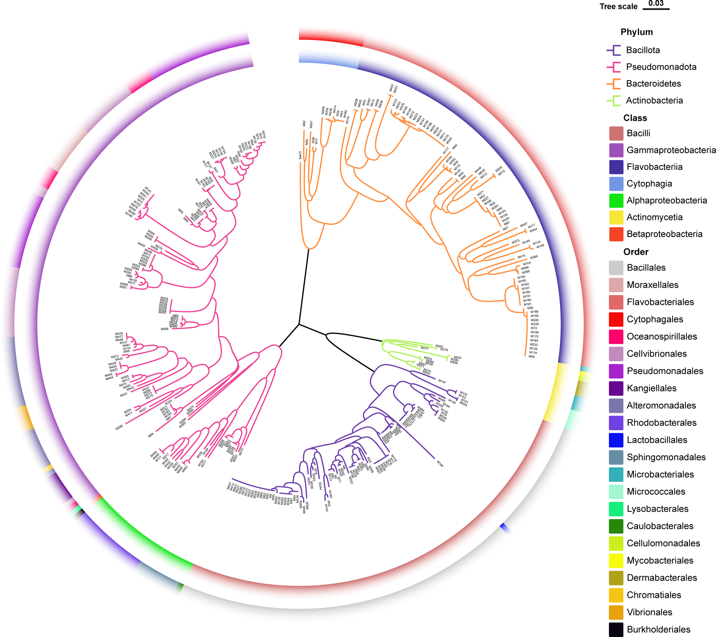 Diversity of culturable bacteria from unvegetated tidal flats of China. Neighbor-joining phylogenetic tree reconstructed from 16S rRNA gene sequences of 352 pure culture isolates. Branches in different colors represent different bacterial phyla; colors on the inner ring refer to bacterial classes; and colors on the outer ring refer to bacterial orders.