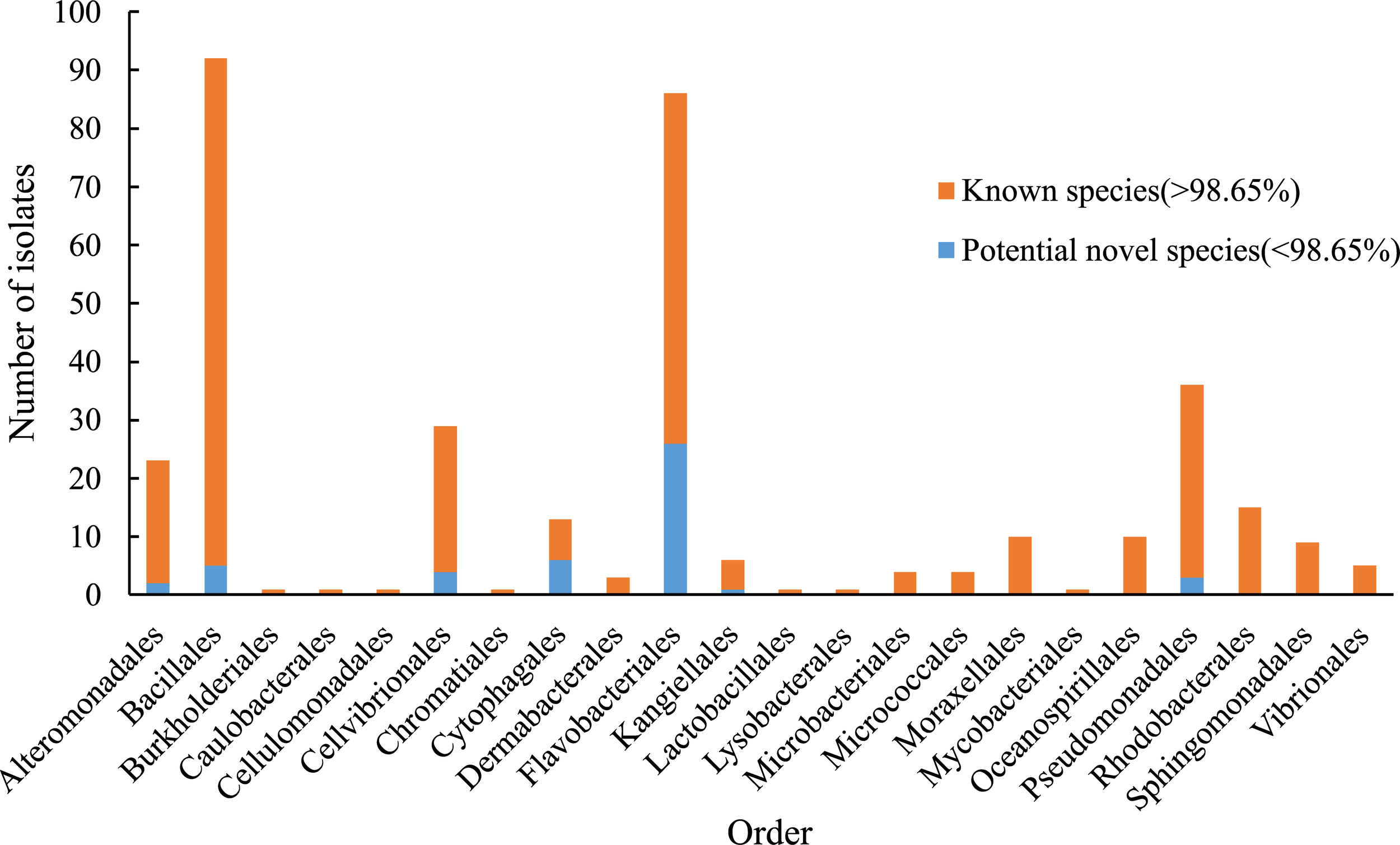 Number of isolates in different orders. Blue bar, the number of potential novel species in each order (16S rRNA gene similarity < 98.65%). Orange bar, the number of identified isolates in each order (16S rRNA gene similarity > 98.65%).
