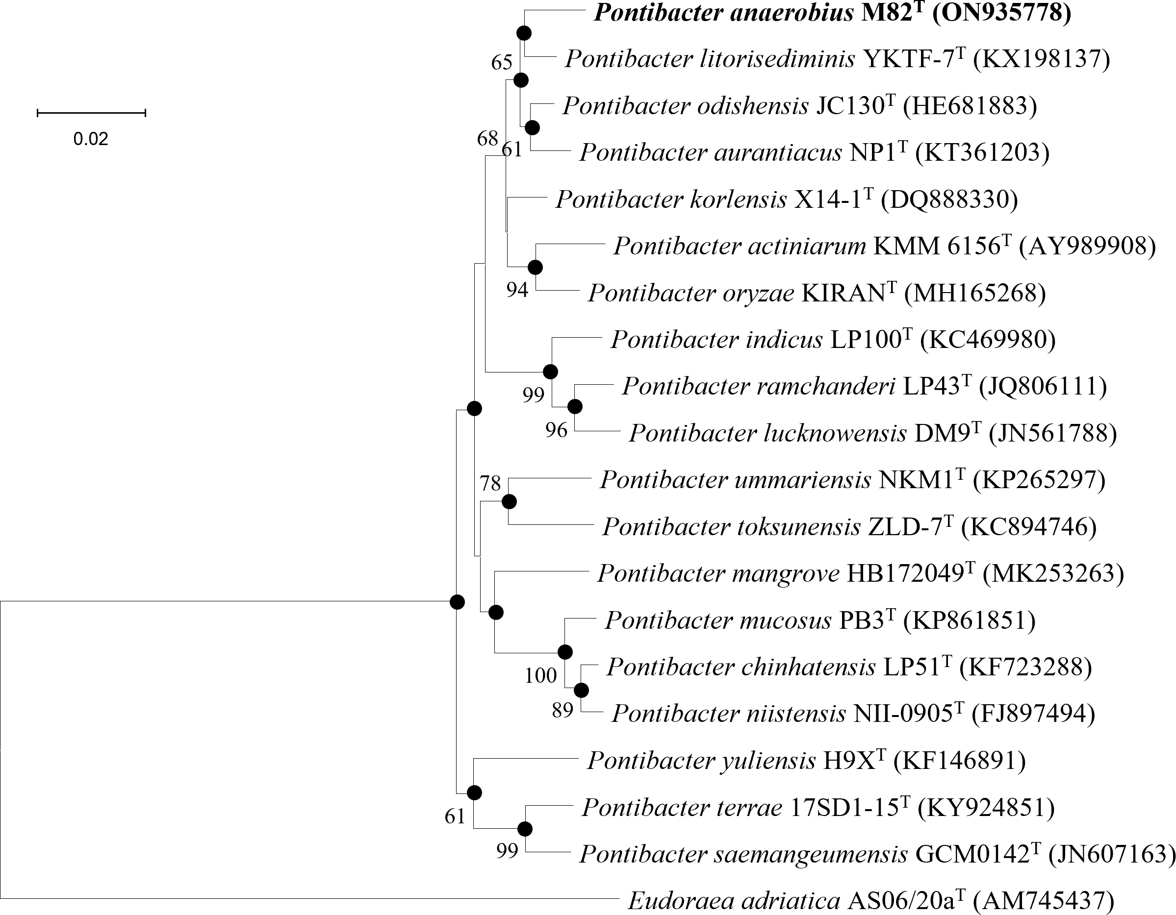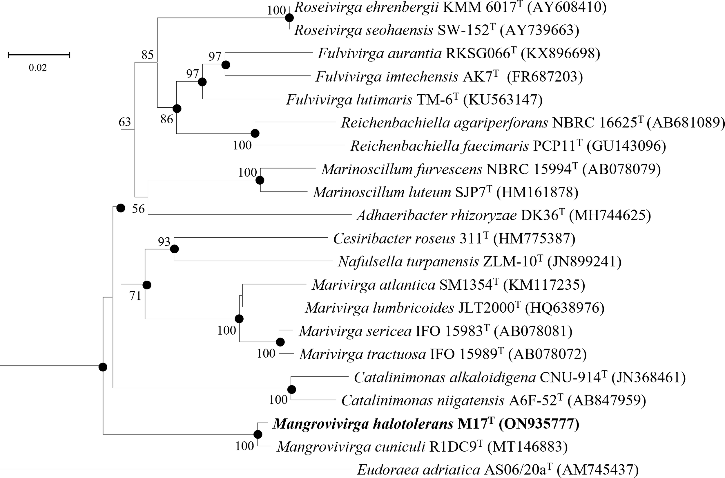 Neighbor-joining phylogenetic tree reconstructed from 16S rRNA gene sequences of strains M17T and related species. Bootstrap values <50% (based on 1,000 replications) are not shown. Filled circles indicate branches that were also recovered using maximum-likelihood and maximum-parsimony methods. Eudoraea adriatica AS06/20aT (AM745437) was used as the outgroup; bar, 0.02 nt substitutions per nucleotide position.