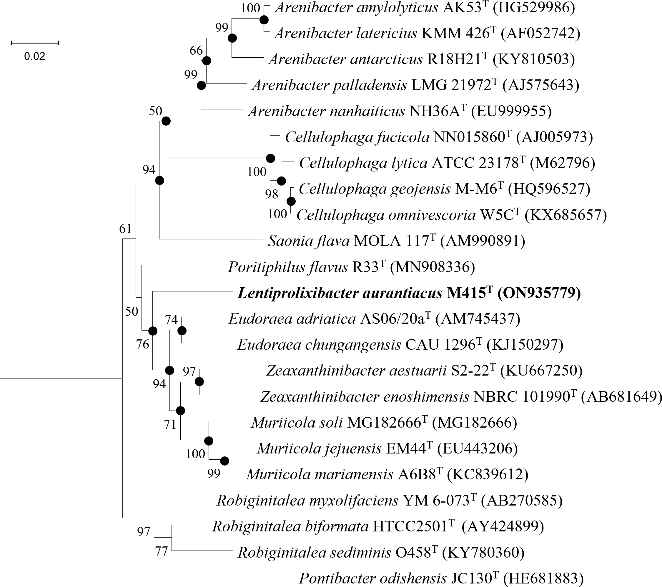 Strains: 1, M17T; 2, M82T; 3, M415T; 4, Mangrovivirga cuniculi KCTC 72349T; 5, Pontibacter actiniarum KCTC 12367T; 6, Pontibacter litorisediminis KCTC 52252T; 7, Zeaxanthinibacter enoshimensis NBRC 101990T; 8, Eudoraea chungangensis KCTC 42048T; 9, Poritiphilus flavus MCCC 1K03853T. All data were obtained from this study unless stated otherwise. +, positive reaction; w, weakly positive reaction; -, negative reaction; NA, data not available. *Colony color in orange, red, and yellow are abbreviated as O, R, and Y, respectively. All strains are positive for the following characteristics: catalase, alkaline phosphatase, esterase (C4), esterase lipase (C8), leucine arylamidase, valine arylamidase, cystine arylamidase, trypsin, acid phosphatase, and naphthol-AS-BI-phosphohydrolase. All strains are negative for the following characteristics: Gram-staining, H2S production, lipase (C14).