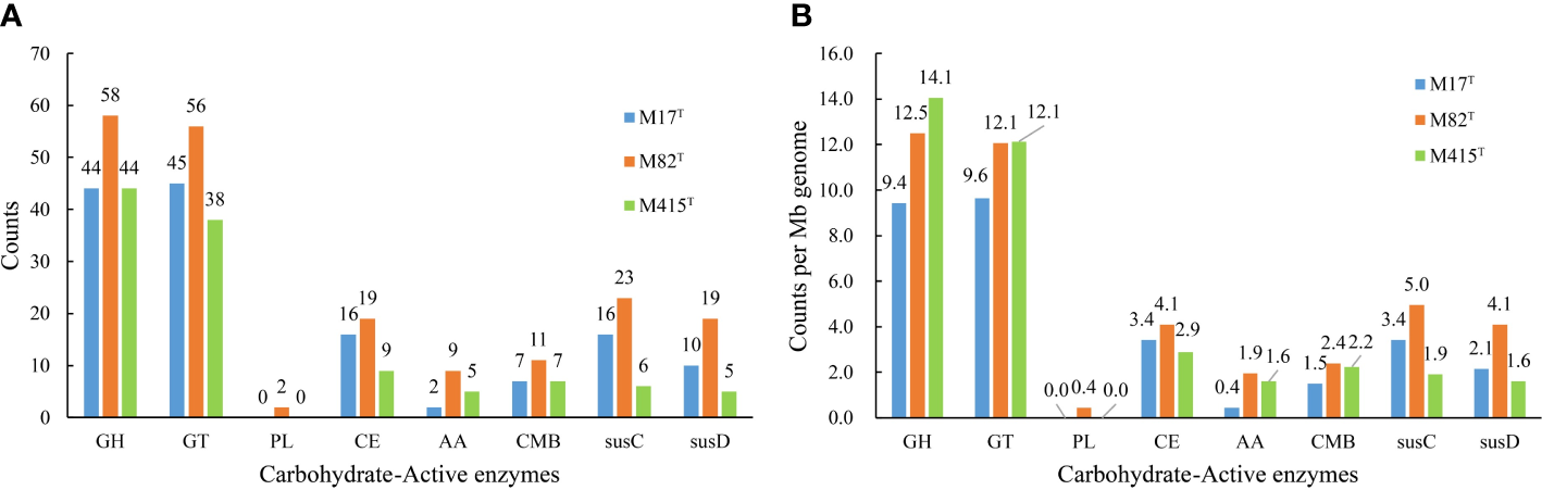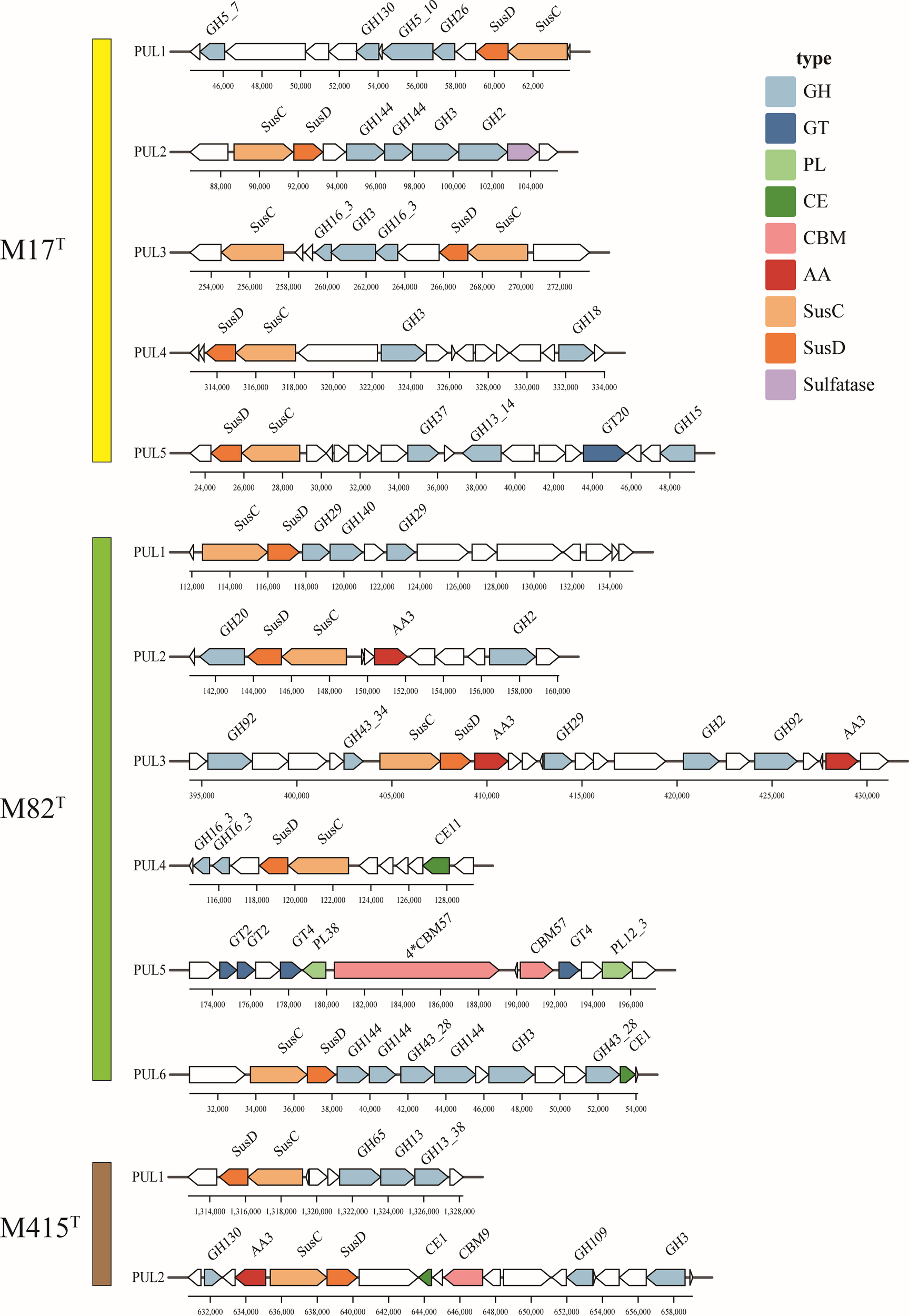 As for the potential in polysaccharide metabolism of strains M17T, M82T, and M415T, carbohydrate-active enzymes (CAZymes) were predicted by the HMMER tools within dbCAN2 software based on Carbohydrate-Active enZYmes Database V11 (CAZy database), and SusC/D-like proteins (SusC, outer membrane TonB-dependent transporter; SusD, surface glycan-binding protein) and other auxiliary proteins and genes were predicted and annotated using PROKKA v1.12 and Rapid Annotation using Subsystem Technology (RAST) version 2.0 (Aziz et al., 2008; Seemann, 2014; Zhang et al., 2018; Drula et al., 2022). The PUL prediction relies on the identification in each genome of the PUL markers: the presence of adjacent genes encoding SusC/D-like proteins, and according to the position of CAZymes and SusC/D-like proteins in the genome, combined with the position of corresponding auxiliary proteins and genes (Terrapon et al., 2015). In addition, the substrates of these PULs were predicted by searching through the PUL database (PULDB) and BLAST the CAZymes through UniProt (Terrapon et al., 2018; Consortium, 2019).