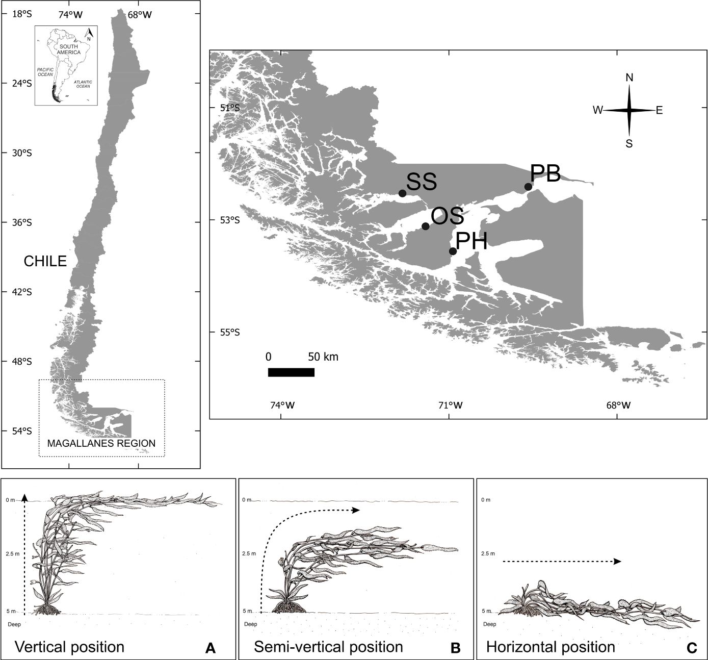 Populations of M. pyrifera studied during this study in the Magellan ecoregion are indicated by the abbreviations: (PB) Possession Bay, (SS) Skyring Sound, (OS) Otway Sound, and (PH) Puerto del Hambre. The position of M. pyrifera sporophytes in their natural environments, are shown in capital letters: (A)M. pyrifera positioned vertically in Otway Sound, Puerto del Hambre and high tide in Possession Bay; (B) semi-vertical position in population of Skyring Sound; and (C) horizontal position at low tide in Possession Bay.