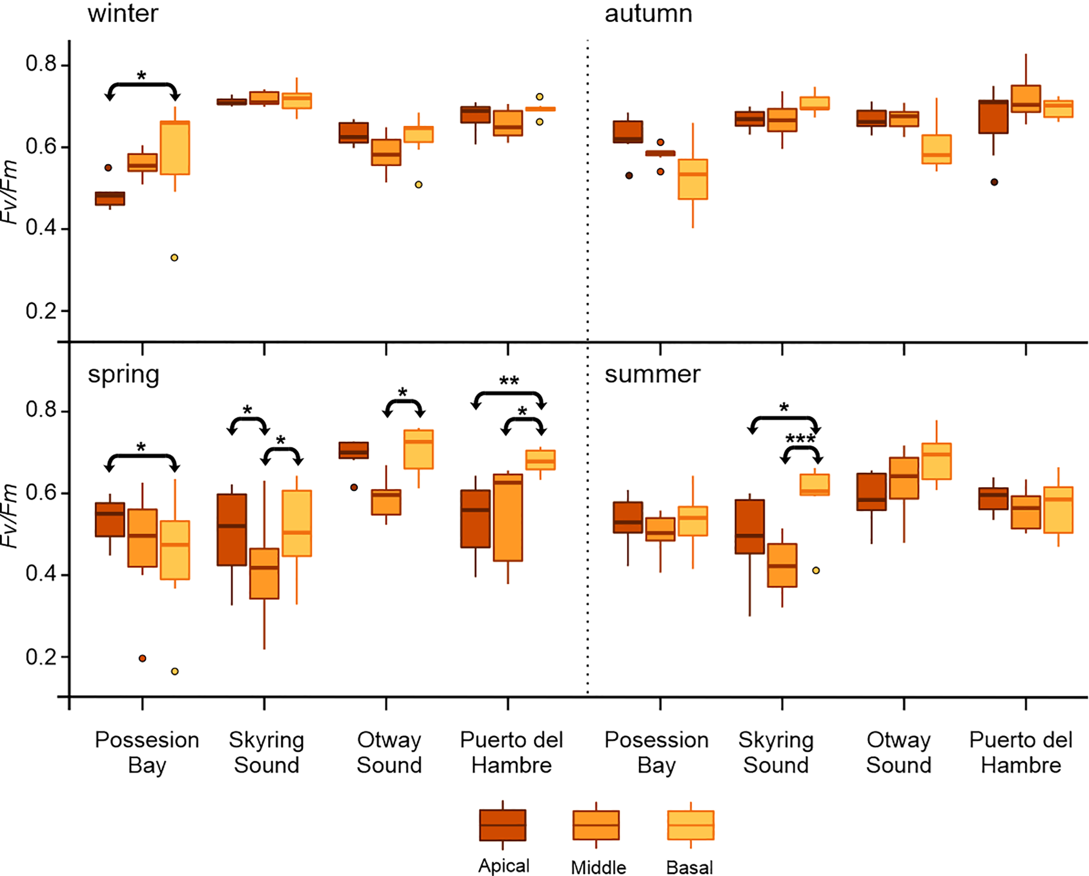 Mean ± SD for Fv/Fm (n=7) in vegetative blades of Macrocystis pyrifera. The figure shows the comparison between frond types (apical, middle, and basal), for each population sampled (Possession Bay, Skyring Sound, Otway Sound, and Puerto del Hambre) seasonally: winter, autumn, spring, and summer. The horizontal line with arrows indicates significant differences between kinds of blades. ***p<0.001, **p<0.01, *p<0.05.