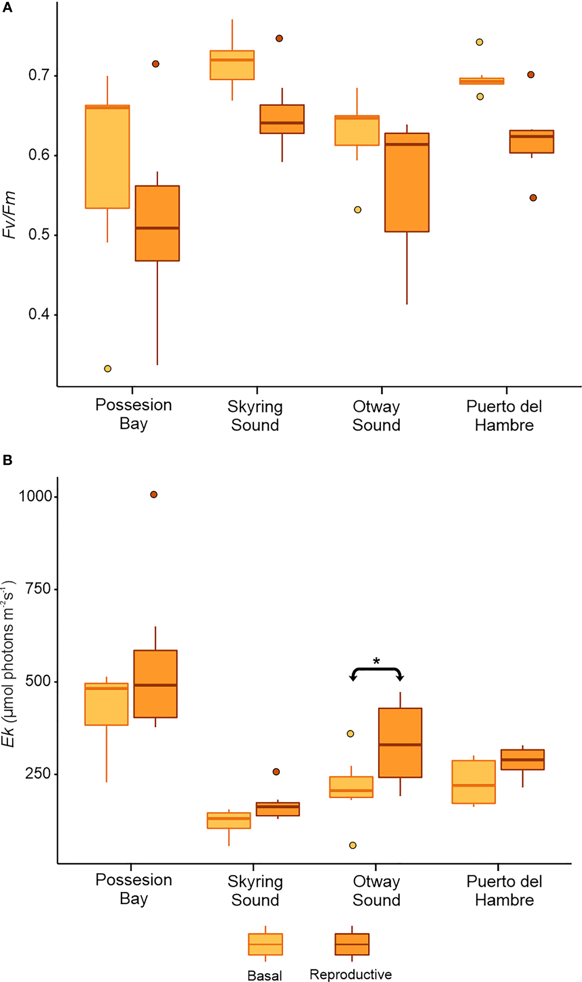 Mean±SD for Fv/Fm and Ek (n=7) in basal and sporophyll blades of Macrocystis pyrifera. The figure shows the comparison for each population sampled (Possesion Bay, Skyring Sound, Otway Sound, and Puerto del Hambre) in winter. (A) parameter optimum quantum yield - Fv/Fm, and (B) parameter saturation point -Ek. The horizontal line with arrows indicates significant differences between kinds of blades. *p<0.05.