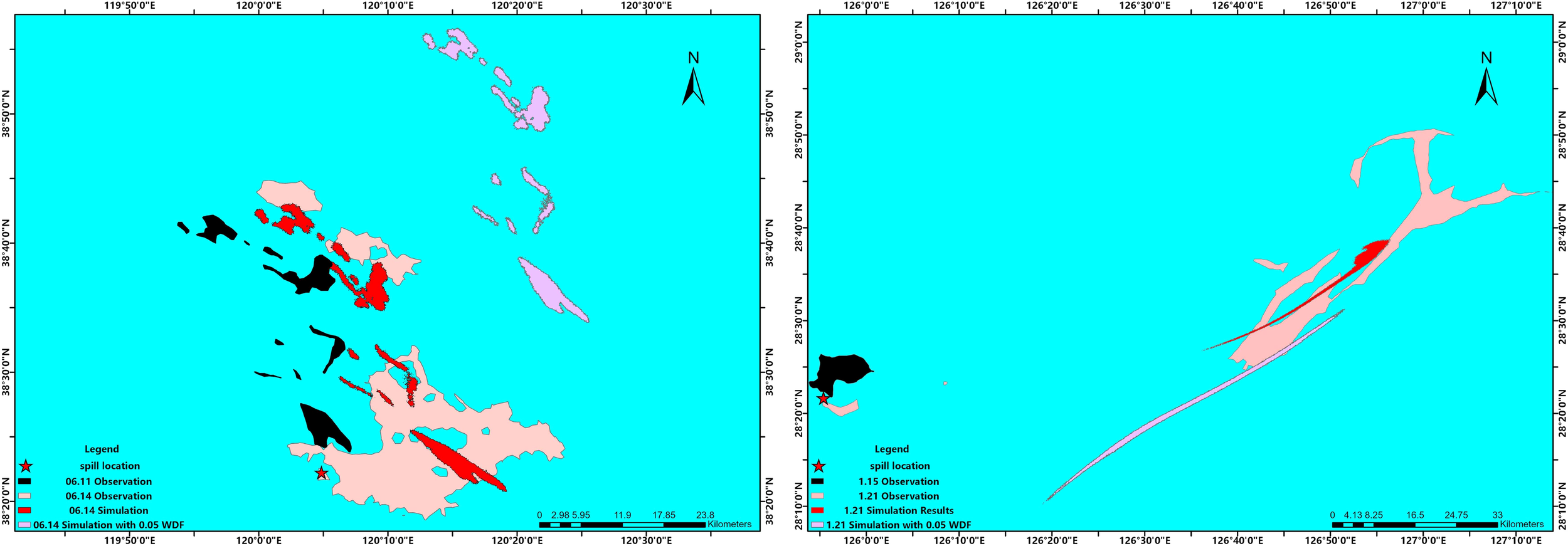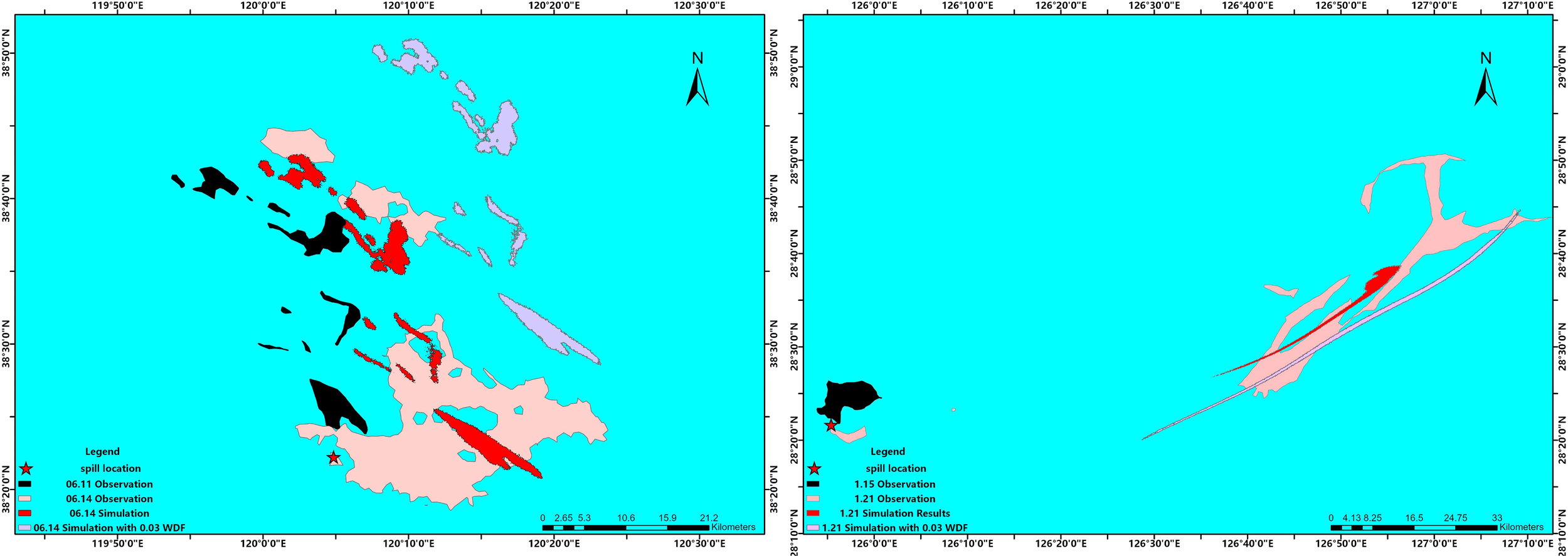 In the traditional oil spill model, the WDF is set using empirical values. According to the previous section, two values are usually used: one is 0–0.03, and the other is 0–0.06. In this section, the simulation results using empirical values are compared with those using parameterization models to verify the feasibility and accuracy of the parameterization model. In addition, based on Eq. 12 in Guo et al. (2018), an index used to quantitatively evaluate the oil spill simulation results was introduced to measure the accuracy of the model: