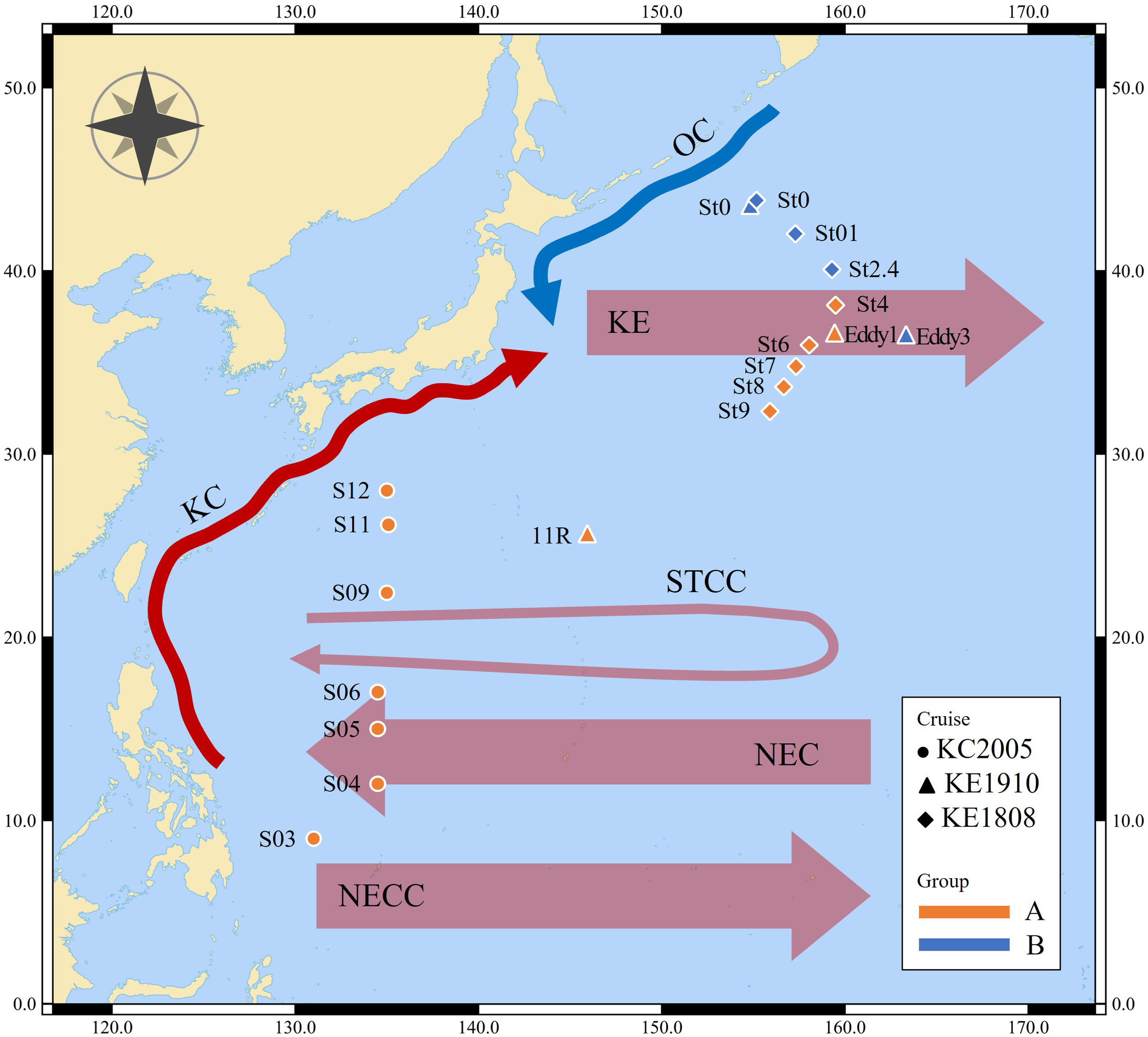 The sampling stations were divided into two groups based on the hydrological data and ocean currents. 1) group A, with high temperatures and salinity in the surface mixed layer was strongly affected by the KC (27.6 (23.3–30.0) °C; 34.5 (33.9–34.8) psu; S03–S12; 11R, Eddy1; St4–St9); 2) group B, with low temperatures and salinity in the surface mixed layer was strongly affected by the OC (17.6 (12.0–22.6) °C; 33.4 (32.6–34.2) psu; St0 (KE1910), Eddy3, St0 (KE1808)–St2.4).