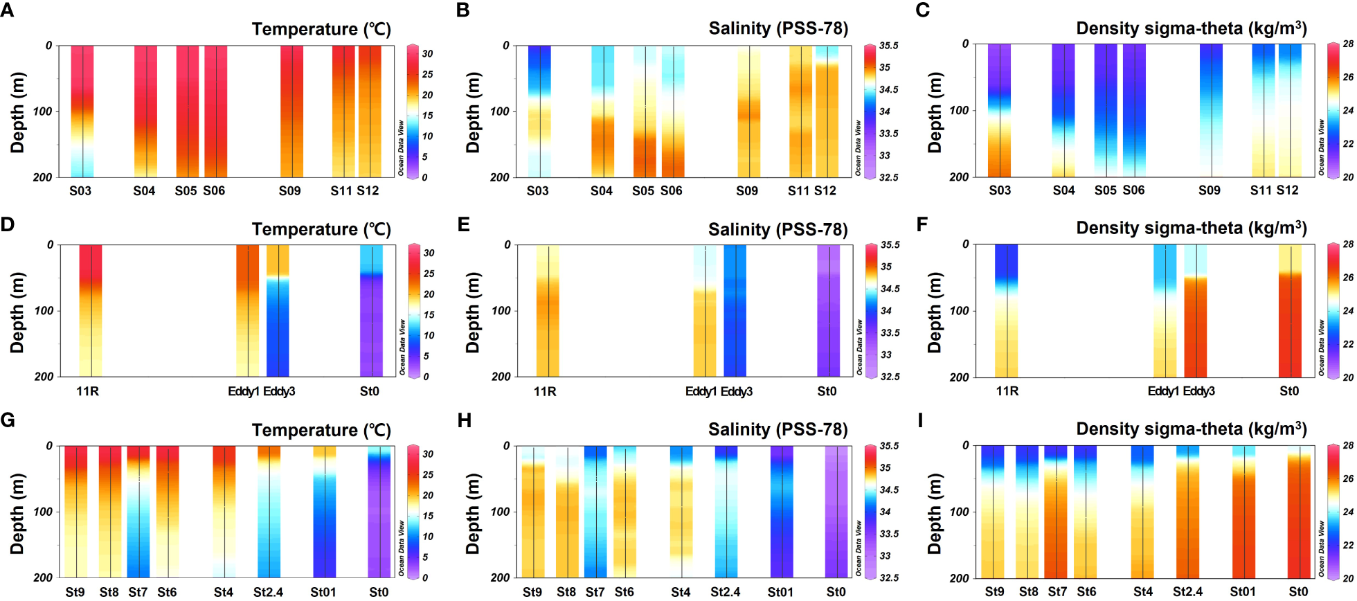 Vertical profile of temperature, salinity, and density in the study area. (A–C) KC2005; (D–F) KE1910; (G–I) KE1808 cruises.