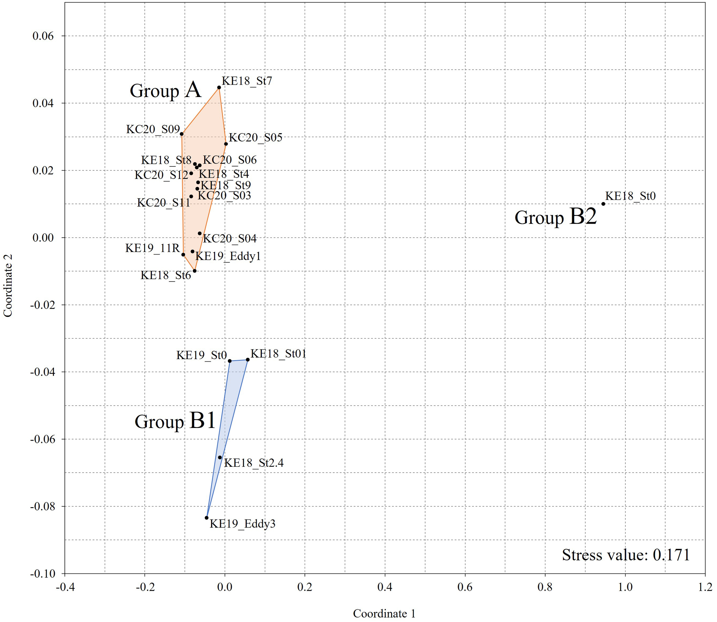 A total of 26 species of siphonophores were recorded from 19 stations, and the highest diversity, with 16 species, was confirmed in S09 and 11R, whereas no siphonophores were recorded in St0 (KE1808) (Table 1). Abylopsis eschscholtzii (Huxley, 1859) and Abylopsis tetragona (Otto, 1823) were recorded at 17 stations, indicating that they were the most extensively distributed among the recorded siphonophores. Hierarchical clustering analysis based on species composition was performed to investigate the correlation between the occurrence of siphonophores and the hydrological features at different stations. Except for St0 (KE1808) (where no siphonophores were recorded), the data were classified into water mass group A (high temperature and high salinity strongly affected by the KC) and group B (low temperature and low salinity strongly affected by the OC) at a 50% similarity level (Figure 4; cophenetic correlation: 0.9292). The NMDS analysis results were also clearly divided into groups A, B, and St0 (KE1808) (Figure 5; stress value: 0.171), which is consistent with previous results based on hydrological conditions.