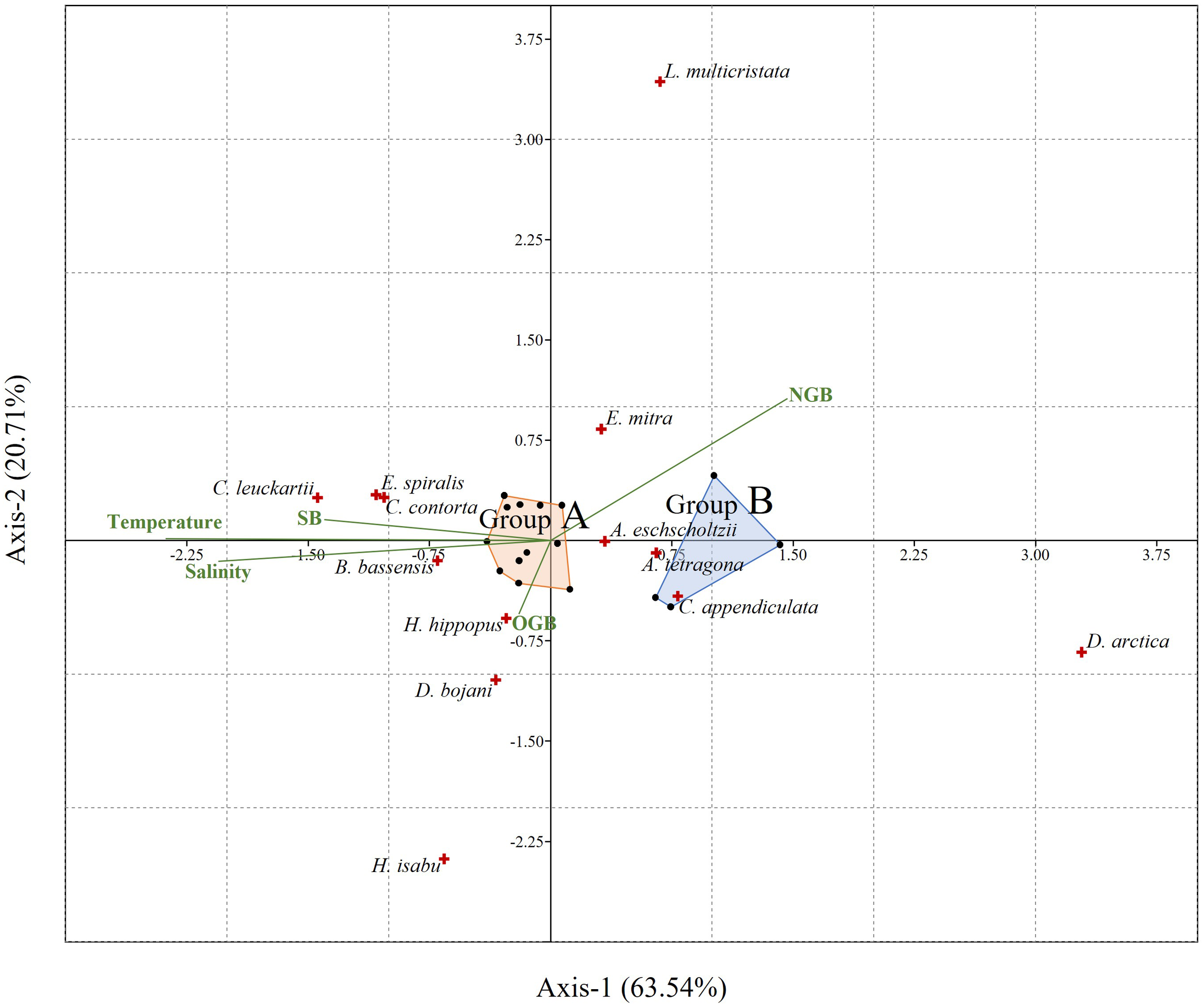 The SIMPER analysis revealed the species that distinguished each cluster. Chelophyes contorta (Lens and van Riemsdijk, 1908), found only at group A stations, had the highest contribution rate at 10.44% (Table 2). Dimophyes arctica (Chun, 1897), mainly occurred at group B stations, with a contribution rate of 8.06%. Bassia bassensis (Quoy and Gaimard, 1833) and Eudoxoides spiralis (Bigelow, 1911) were also unequally distributed in group A stations, with comparatively high contributions of 8.04% and 7.97%, respectively. Based on the SIMPER analysis, 13 species accounted for 82.54% of the total contribution, and each contribution rate was greater than 3%. Correlations between these 13 major species and water temperature, salinity, and biomass (siphonophores, other gelatinous, and non-gelatinous zooplankton) were derived from the CCA results (Figure 6). The eigenvalues of Axis-1 and Axis-2 were 0.098 and 0.032, respectively, and these two axes explained 84.25% (Axis-1: 63.54%; Axis-2: 20.71%) of the total variance. Regarding environmental factors, the siphonophore biomass exhibited a vector similar to that of temperature and salinity. In contrast, the biomass of non-gelatinous zooplankton showed a vector opposite to those of temperature, salinity, and siphonophore biomass. The biomass of the other gelatinous zooplankton exhibited a short vector that was not coupled with other environmental factors. E. spiralis, C. contorta, Ceratocymba leuckartii (Huxley, 1859), B. bassensis, Hippopodius hippopus (Forsskal, 1776), and Diphyes bojani (Eschscholtz, 1825) showed a positive correlation with water temperature and salinity based on Axis-1. However, Chelophyes appendiculata (Eschscholtz, 1829), A. tetragona, A. eschscholtzii, D. arctica, and Eudoxoides mitra (Huxley, 1859) were negatively correlated with water temperature and salinity. Halistemma isabuPark and Lee, 2020, and Lensia multicristata (Moser, 1925) were not significantly correlated with any environmental factors.