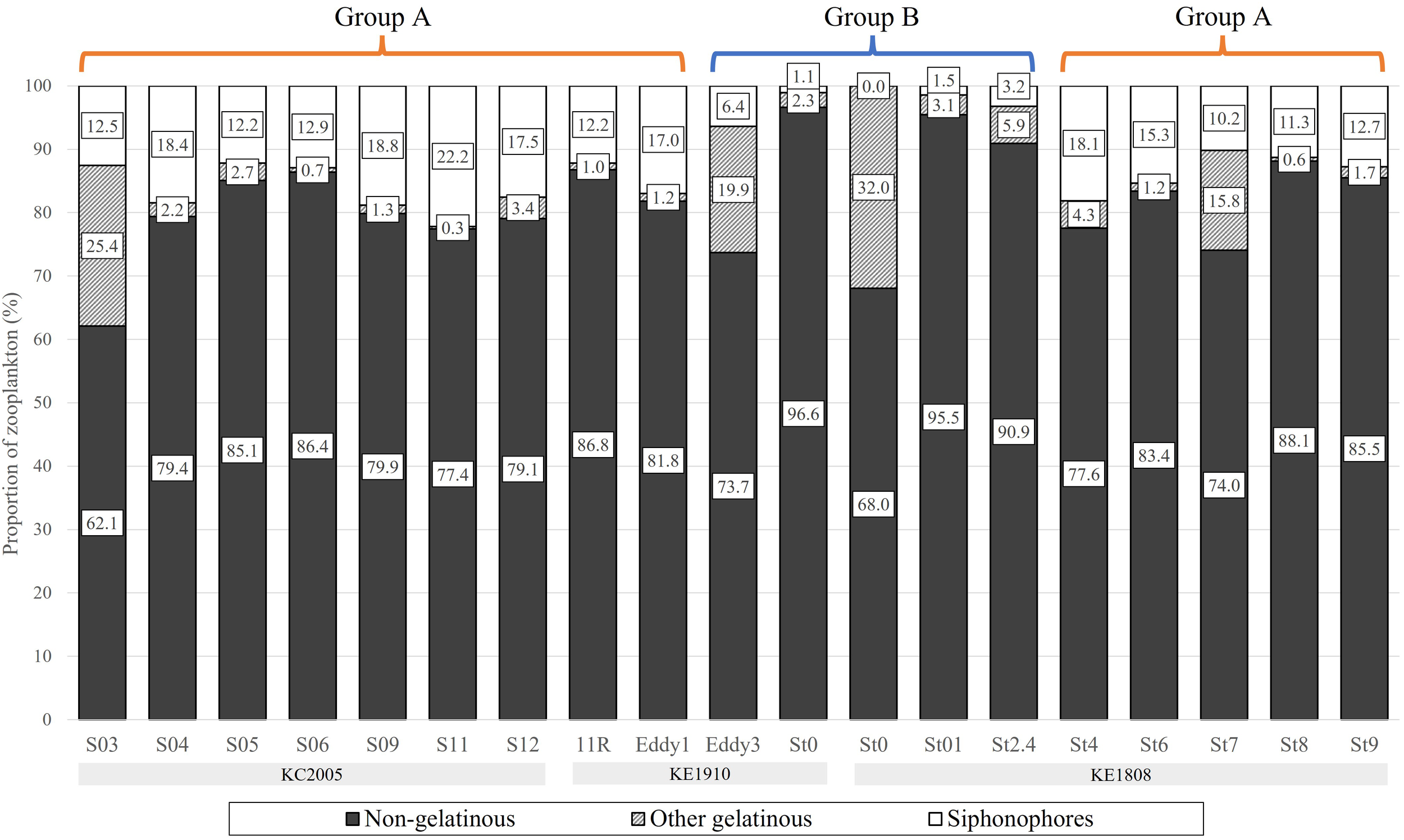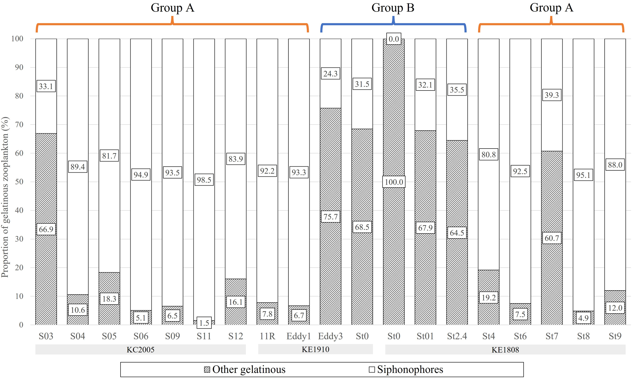 Most studies on plankton ecology worldwide are biased towards copepods and have used them as indicators (Richard and Jamet, 2001; Hwang and Wong, 2005; Hwang et al., 2006; Campos et al., 2017; Seo et al., 2018; Choi et al., 2020; de Oliveira Dias et al., 2023) although it is difficult to explain the entire system using only a few taxa because of the presence of diverse organisms. One major limitation of this approach is the evaluation of gelatinous zooplankton. Gelatinous zooplankton is a generic term for transparent planktonic organisms with gelatinous tissue containing a high percentage of water, including medusae, siphonophores, ctenophores, chaetognaths, tunicates, and pteropods (Hammer, 1975; Madin and Harbison, 2001; Raskoff et al., 2003). Gelatinous zooplankton can be a food source connecting primary producers and high trophic level consumers, and they play a vital role in marine ecosystems (Hays et al., 2018). A previous study showed that gelatinous zooplankton can contribute up to approximately 25% of the total pelagic biomass (Robison, 2004). Purcell (2005) and Holst (2012) reported a correlation between the community structure of jellyfish and climate change, and suggested that it is essential to clarify this relationship. However, despite their important role in marine ecosystems, it is difficult to study gelatinous zooplankton using traditional methods because of their fragile bodies and patchy distributions (Fleming et al., 2011; Henschke et al., 2016). A limited number of studies have been conducted on the giant and well-known scyphozoan jellyfish (Zhang et al., 2012; Morita et al., 2017). However, despite the high diversity and biomass of non-scyphozoan gelatinous zooplankton, such as siphonophores and pyrosomatids, research on these groups remains insufficient (Weikert and Godeaux, 2008; Palma et al., 2014). Although some studies have shown that salp blooms are associated with phytoplankton (Kang et al., 2019), few ecological studies have been conducted on siphonophores.