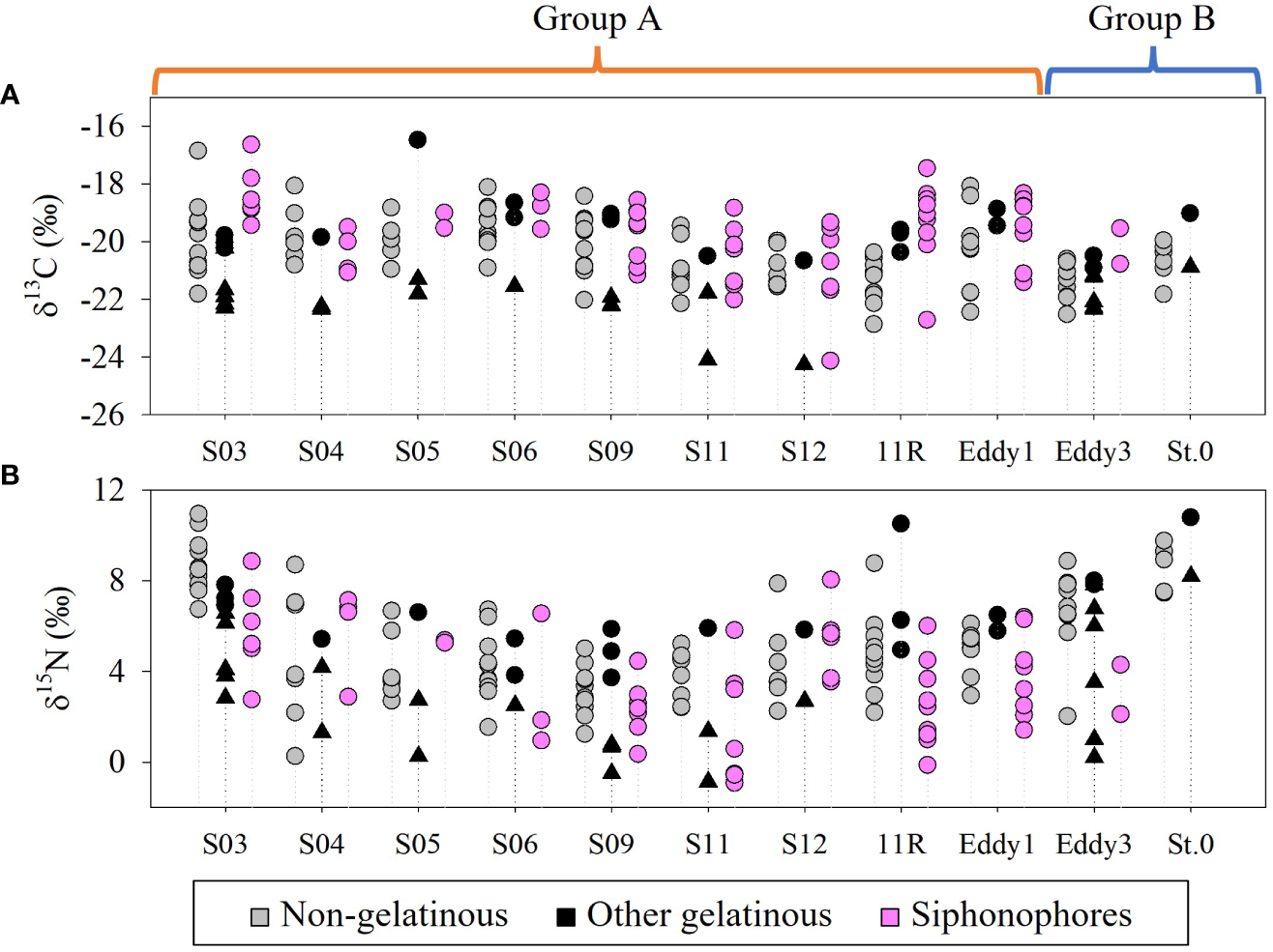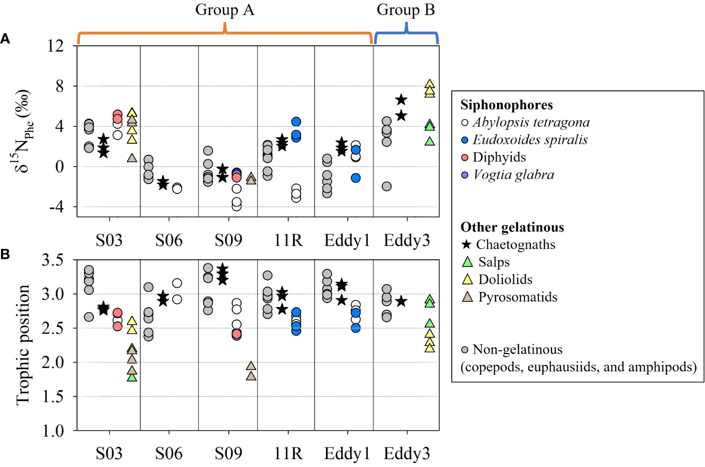 Previous studies have elucidated the predatory feeding of siphonophores based on morphological and phylogenetic analyses (Damian-Serrano et al., 2021). Such feeding ecology can be recorded as variations in stable isotope ratios in consumer tissue, allowing the illustration of the food web structure, i.e., diet source and trophic position (TP), using carbon (δ13C) and nitrogen (δ15N) isotope ratios, respectively (Minagawa and Wada, 1984; Post, 2002). δ13C and δ15N analysis has suggested that some gelatinous zooplankton can potentially compete with non-gelatinous zooplankton for diet resources in the same space, owing to their similar stable isotope compositions (Chi et al., 2021). Meanwhile, δ15N analysis of individual amino acids (AAs) has been increasingly used to understand the TP of consumers based on the separation between trophic enrichment and basal nitrogen sources (trophic and source AAs, respectively) (Chikaraishi et al., 2009; McMahon and McCarthy, 2016; Choi et al., 2017). The TPs of zooplankton provide informative signals of dietary composition and variation based on environmental changes (Décima et al., 2013; Loick-Wilde et al., 2019; Choi et al., 2021). The δ15N of AAs could provide a better understanding of trophic ecology, including both gelatinous and non-gelatinous zooplankton.