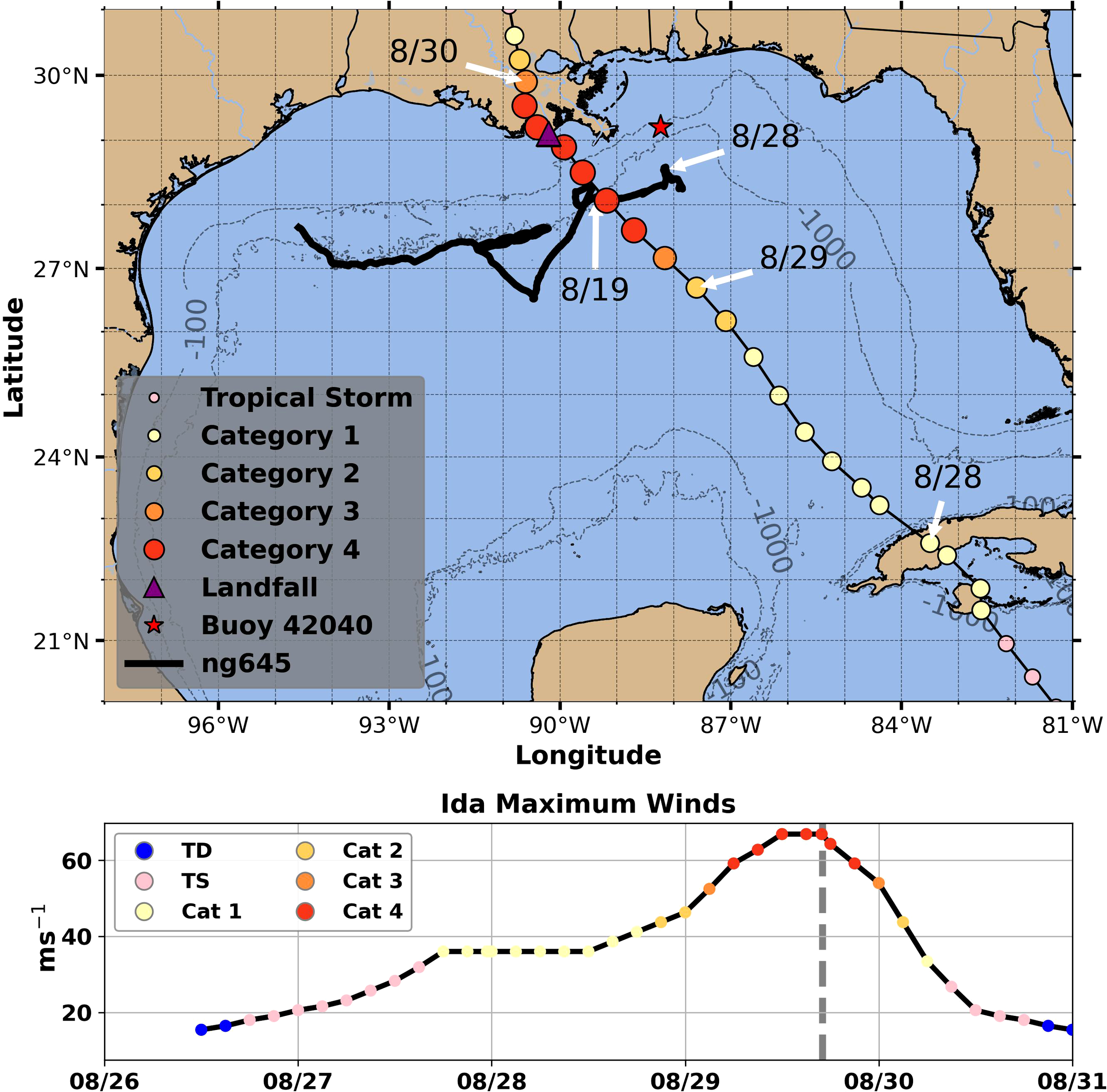 A map (top) of Hurricane Ida’s NHC best track with colored circles denoting the storm’s category in three-hour increments, with an additional purple triangle denoting landfall. Arrows pointing to track locations indicate Ida’s position on 8/28, 8/29, and 8/30 for reference. The black line indicates the NG645 glider track, with additional arrows indicating the glider position on 8/19 and 8/28 for reference to profiles used to initialize our PWP experiments. NDBC Buoy 42040 is represented by the red star. A time-series (bottom) of Ida’s NHC best track maximum wind speed and intensity (colored circles) as well as the storms landfall time (dashed grey line).