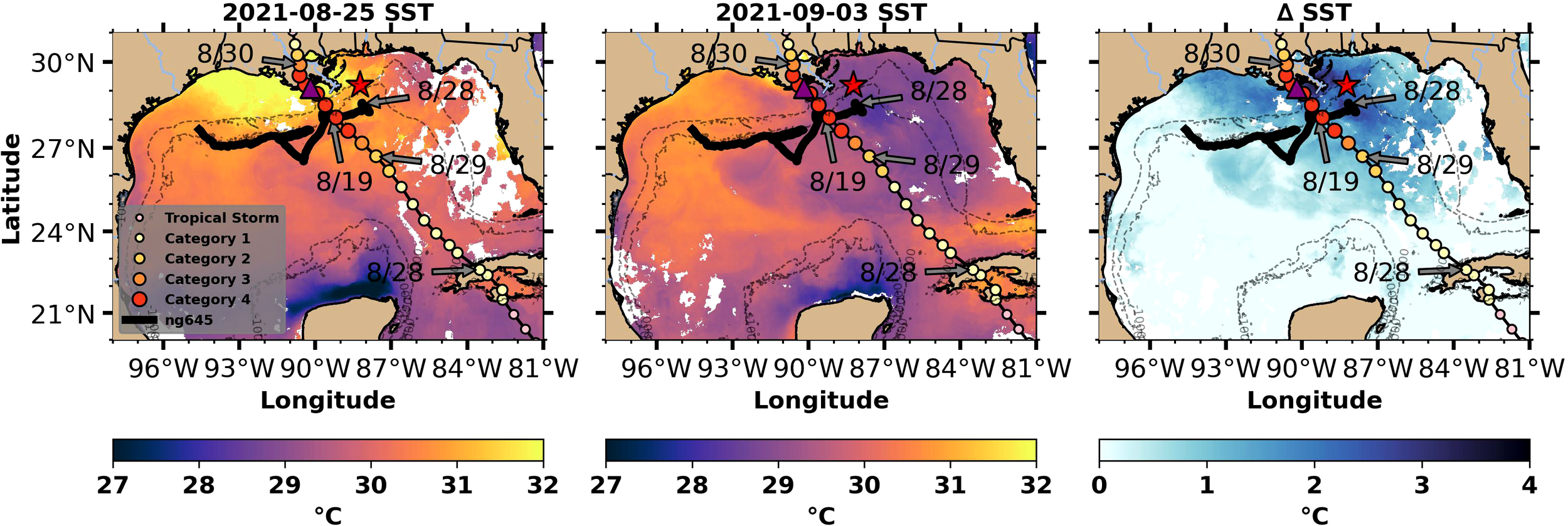 Maps of Sea Surface Temperature (SST) from GOES16 SST daily composite SST on 8/25 (left) and 9/3 (middle). The right panel is the difference (8/25 – 9/3) in SST with positive values indicating ocean cooling. Hurricane Ida’s storm track as-in Figure 1, with an additional time reference arrow at 8/29.
