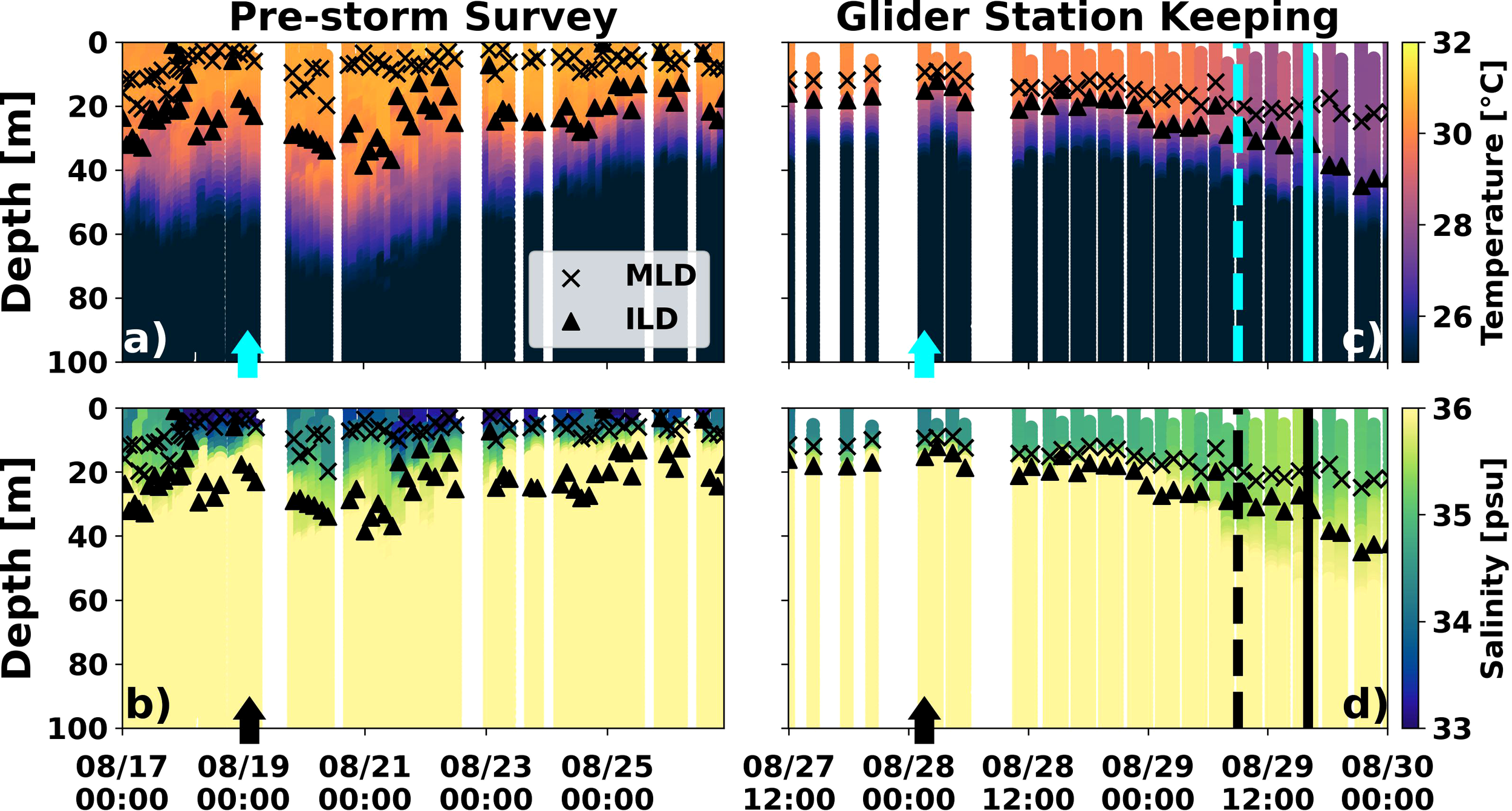Cross-sections (Figure 4) and derived upper ocean metrics (Figure 4) demonstrate pre-storm ocean properties during the cross-track storm survey period (08/17 – 08/27) and the ocean response to the right of the storm track during the station keeping period (08/27 – 08/31). During the pre-storm survey period the glider observed an isothermal warm (>30°C) layer extending to ~30 meters depth to the west and ahead of the storm track. As the glider progressed eastward the isothermal layer shoaled to<20 meters. In contrast, the MLD was found near the surface (<5m) because of a shallow layer of low salinity water (~ 32.5 to 34.5 PSU) aside from a brief salty surface salinity on 08/17.