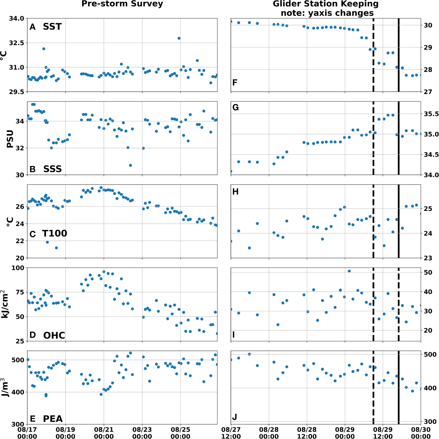 Upper ocean metrics derived from NG645 data split into pre-storm survey (A–E) 8/17 to 8/27 and glider station keeping (F–J) 8/27 to 8/30. SST (A,F), SSS (B, G), T100 (C, H), OHC (D, I), and PEA (E, J). Note the glider station keeping y-axis differs from the pre-storm survey. The vertical lines represent the times when Hurricane Ida passed the glider (dashed line) and made landfall (solid line), respectively.