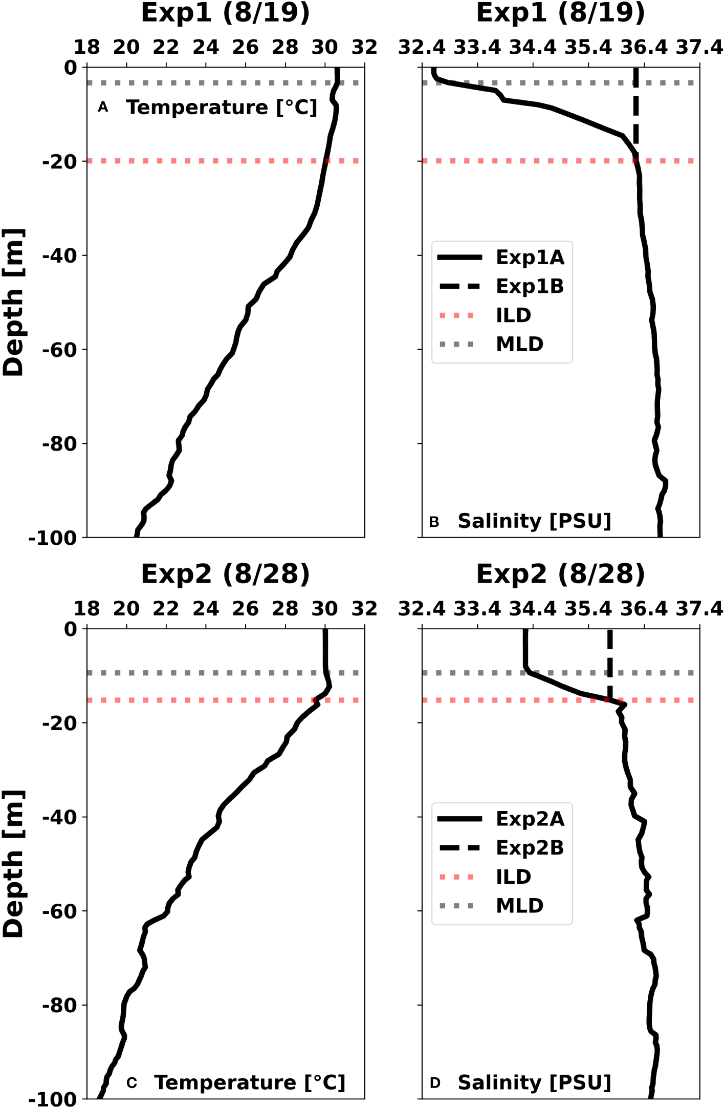 Initial profiles of temperature (A, C) and salinity (B, D) from Glider NG645 on 8/19 and 8/28 used to initalize PWP experiments 1 (A, B) and 2 (B, C). Panel a shows the initial temperature profiles from 8/19 for Exp1A and Exp1B. Panel b) shows the initial salinity profiles from 8/19 for Exp1A inclusive of the barrier layer (solid black line) and Exp1B - barrier layer removed (dashed black line). Panel c shows the initial temperature profiles from 8/28 for Exp2A and Exp2B. (D) shows the initial salinity profiles from 8/28 for Exp2A inclusive of the barrier layer (solid black line) and Exp2B - barrier layer removed (dashed black line). In all panels, the dashed gray line and dashed red line represent the MLD and ILD, respectively.