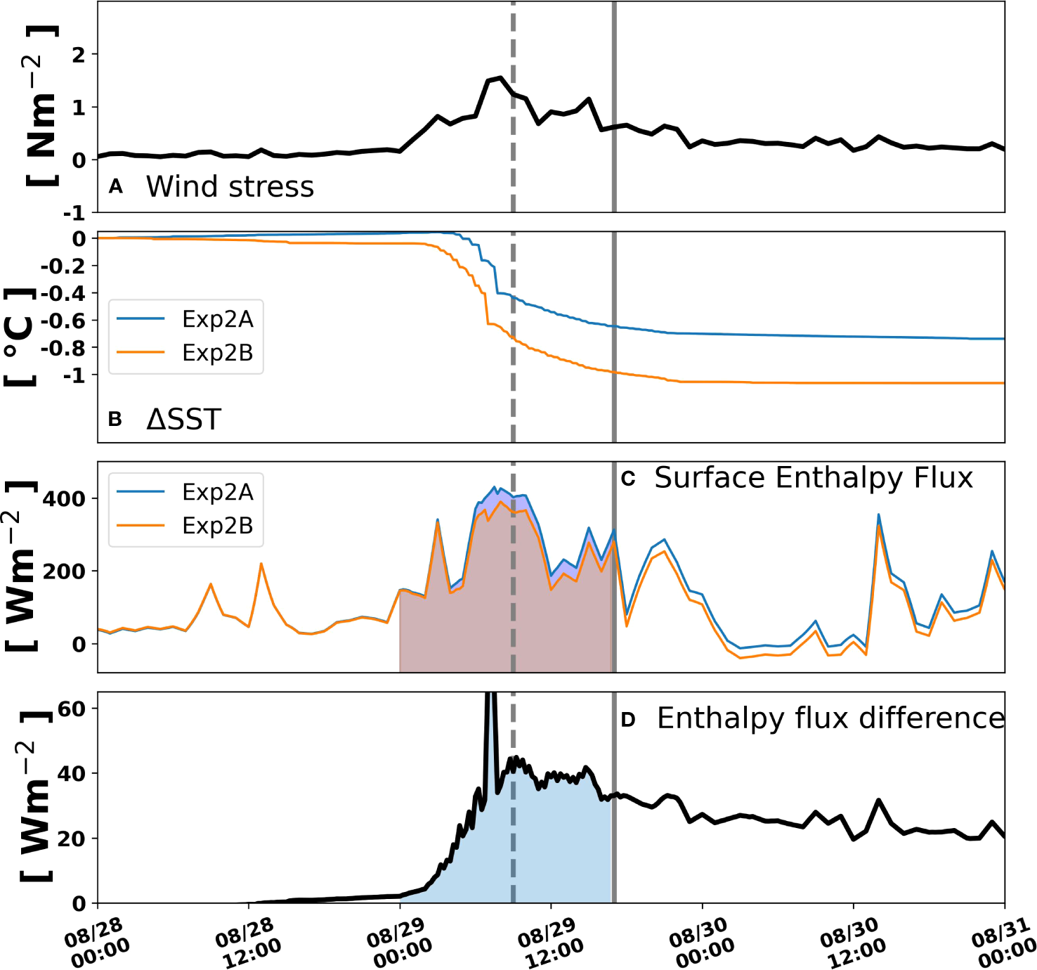Time-series plots from experiment 1 (A) wind stress, (B) ΔSST from both Exp1A (blue) and Exp1B (orange), (C) surface enthalpy flux from both Exp1A (blue) and Exp1B (orange), and (D) difference (Exp1A – Exp1B). The shading in c and d represents the period used to calculate the cumulative enthalpy flux. The vertical lines represent the times at which Hurricane Ida passed the glider (dashed line) and made landfall (solid line).