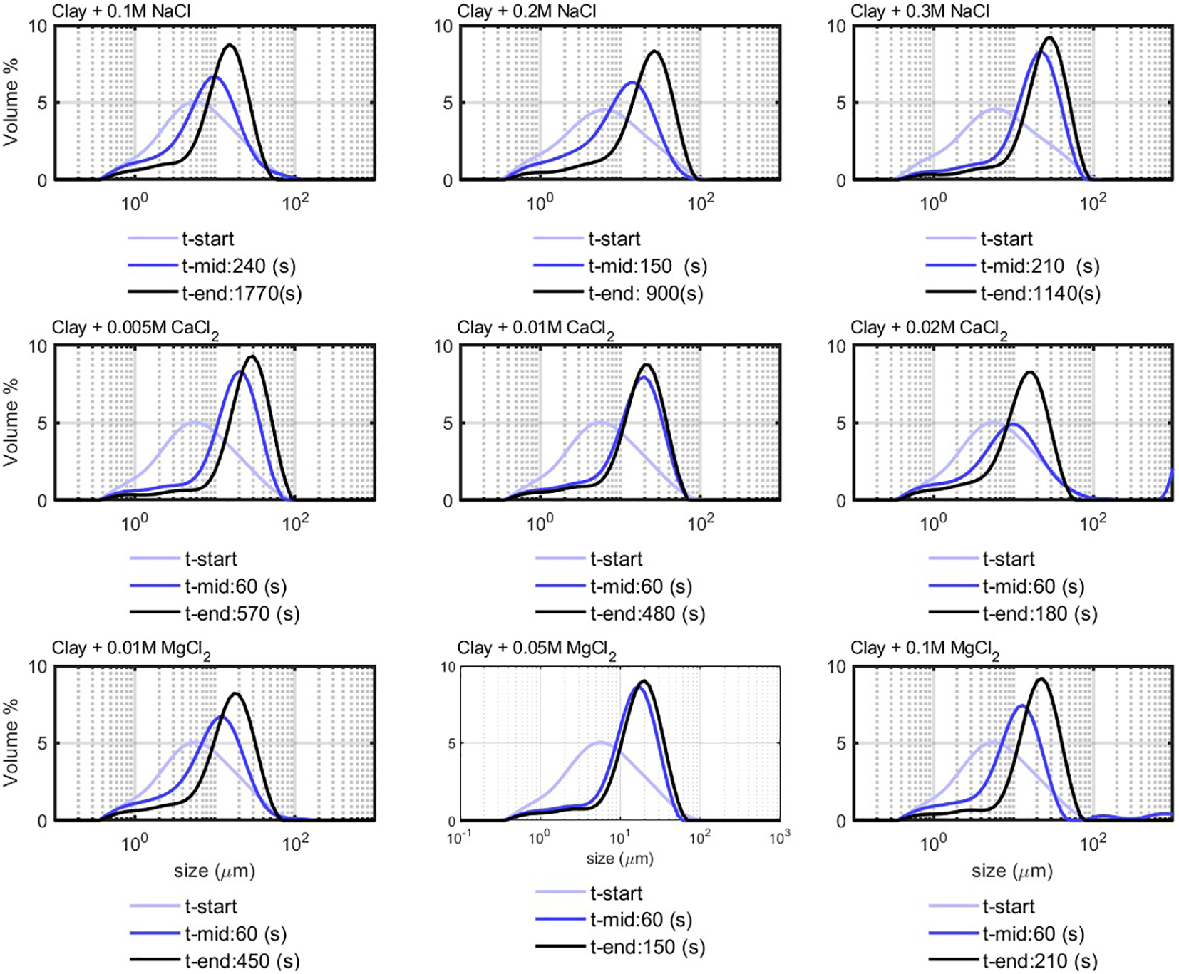 Flocculation of clay (0.7 g/L) with salt; t-start corresponds to the start of experiment, and t-end corresponds to the time at which the peak in PSD reached equilibrium.