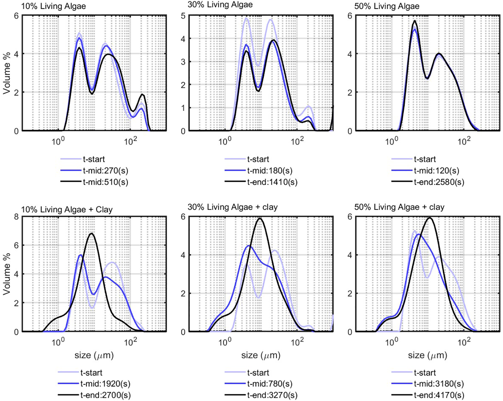 LA in seawater at different volume percentages were studied to check whether the algae cells would flocculate over time. The corresponding PSDs are shown in the first panel of Figure 5. The PSDs are multimodal for every algae concentration and do not vary significantly over time, which indicates that the algae kept their elongated structure over time. After addition of clay to the suspensions (see lower panel of Figure 5), flocculation takes place gradually and the PSDs reached an equilibrium. The flocculation time (time to reach t-eq) was observed to increase with algae concentration.