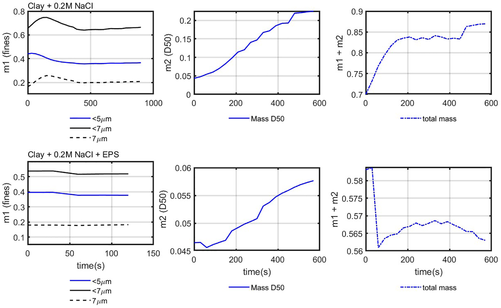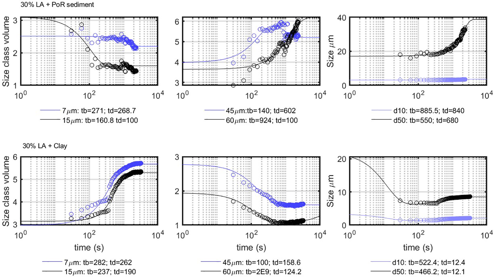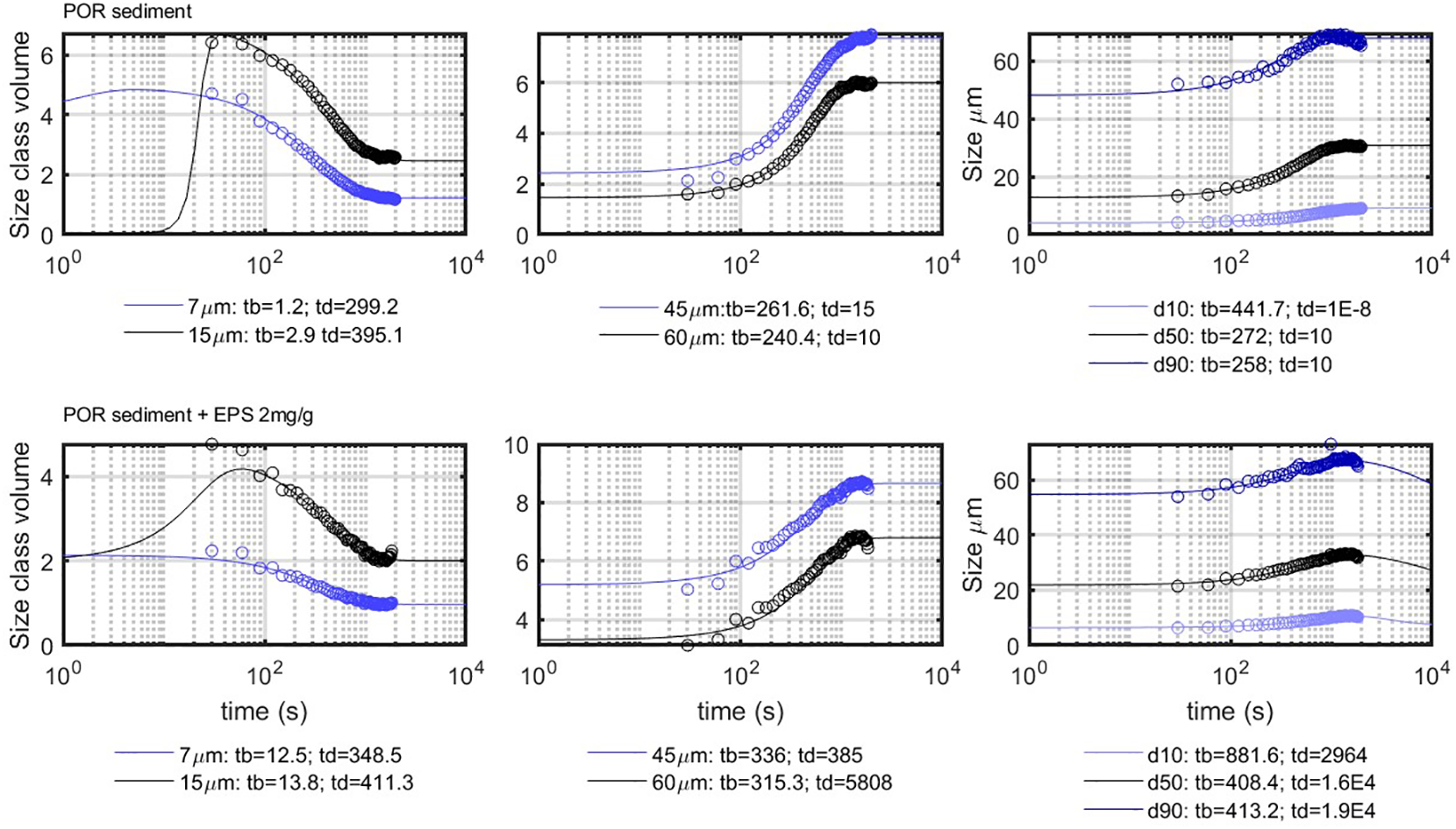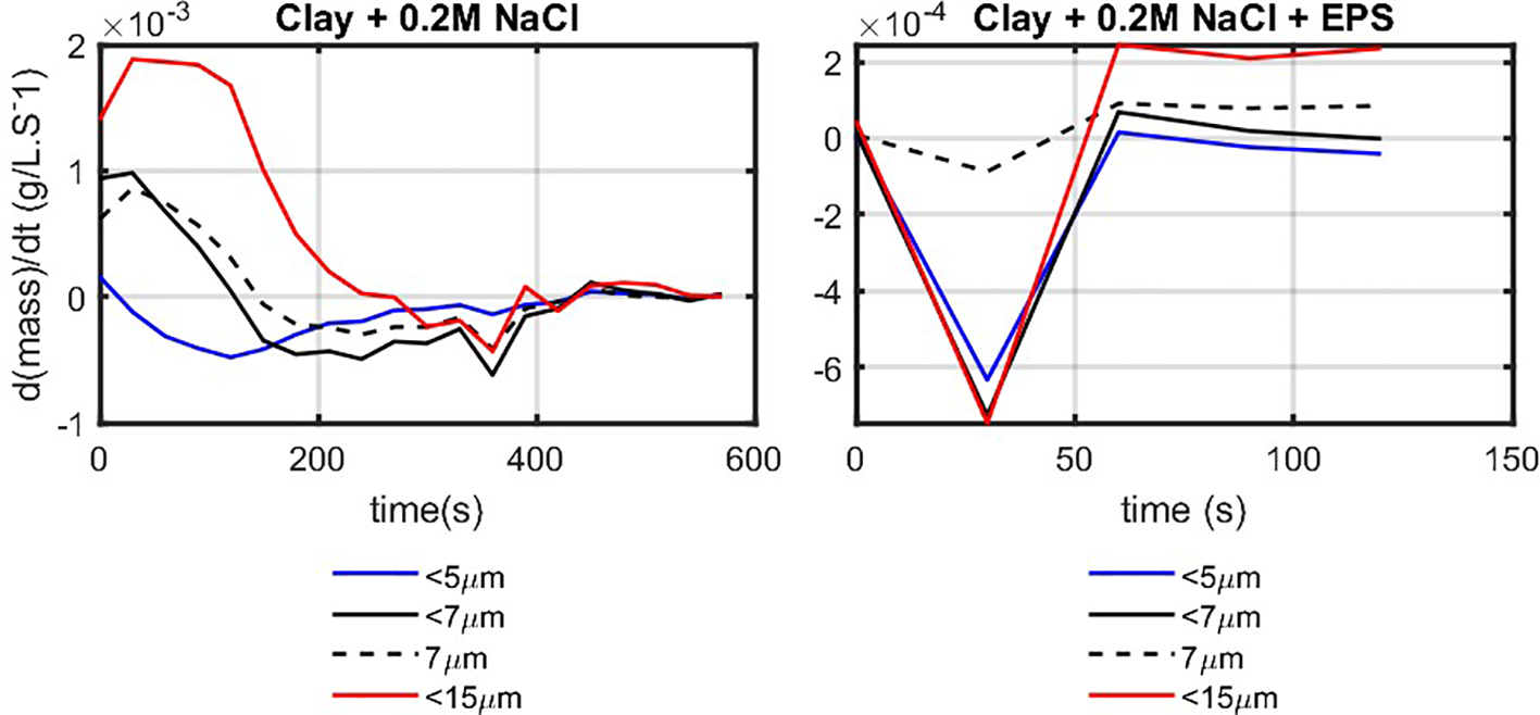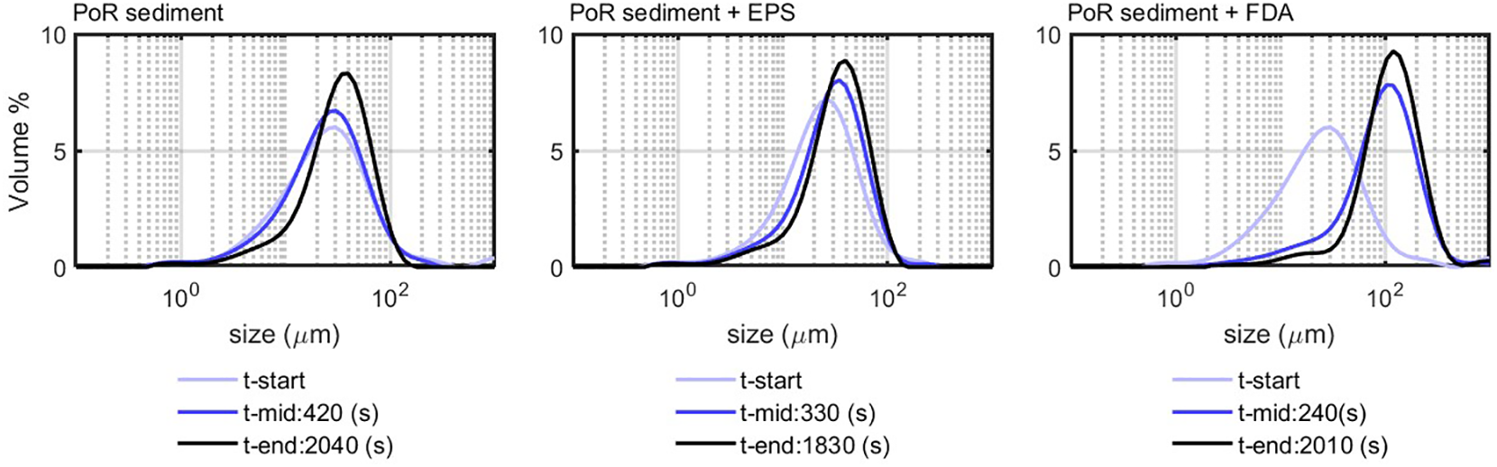 Natural sediment obtained from PoR was suspended in filtered seawater and left to flocculate without addition of any flocculating agent. The left panel of Figure 6 shows the PSD of PoR sediment that reaches an equilibrium PSD, with a peak value of about 30 m after 2,040 s under constant shear. This peak equilibrium size is larger than the Kolmogorov microscale of the system, which indicates that the natural PoR sediment might contain some organic matter or large silt particles.
