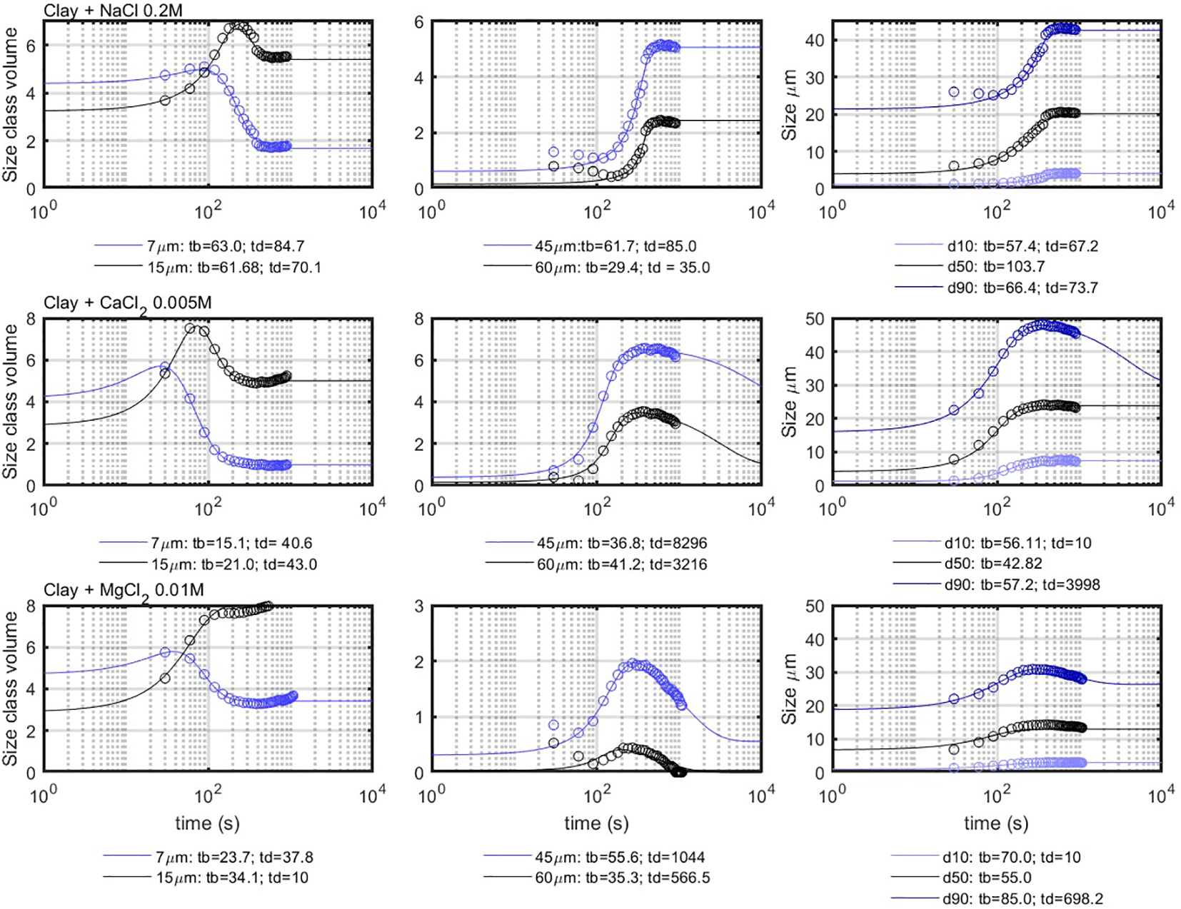 The difference, however, is in the time needed to reach an equilibrium size. The characteristic time t-eq is defined as the time for which the full PSD reach equilibrium. Flocculation with NaCl takes much more time than with and . This confirms the efficiency of divalent salt in the flocculation of clay (Mietta et al., 2011b). The t-eq was in the range of 150–400 s for divalent salts and of 600–1,000 s for monovalent salt, for the concentrations used. The way that t-eq is linked to the “birth” and “decay” times and will be shown in the modeling section.