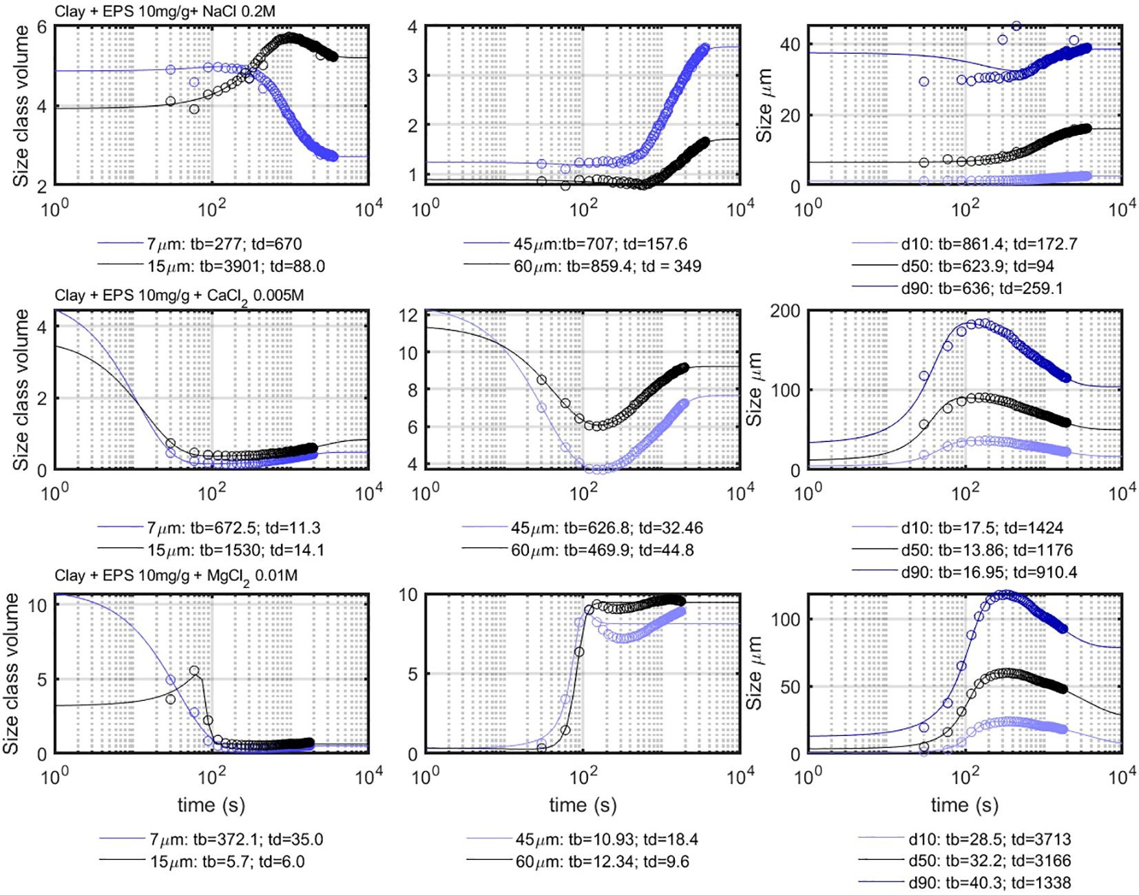 Flocculation with anionic (negatively charged) polymers is possible in case cations can act as bridging agents (Shakeel et al., 2020). After addition of salt to the clay and organic matter suspensions, flocculation takes place (see Figure 4), and the peak in PSD increases eventually exceeding the Kolmogorov microscale of the system. The divalent salts (and ) produce larger flocs in shorter times, compared with NaCl. The peak in PSD decreases after reaching its maximum size . At this stage, the flocs coil under shear and become denser, hereby decreasing in size. At the end of the experiment (t-end), the peak in PSD is, therefore, lower than that in t- , which is the time at which the peak value is highest.