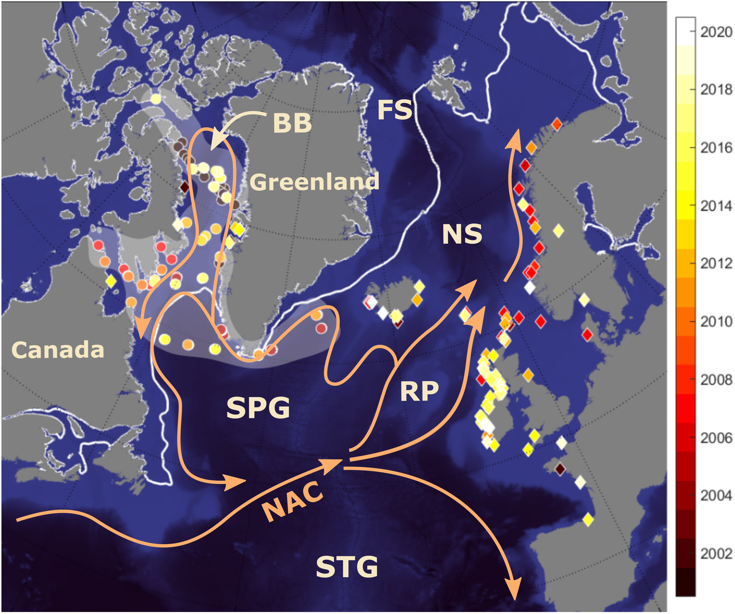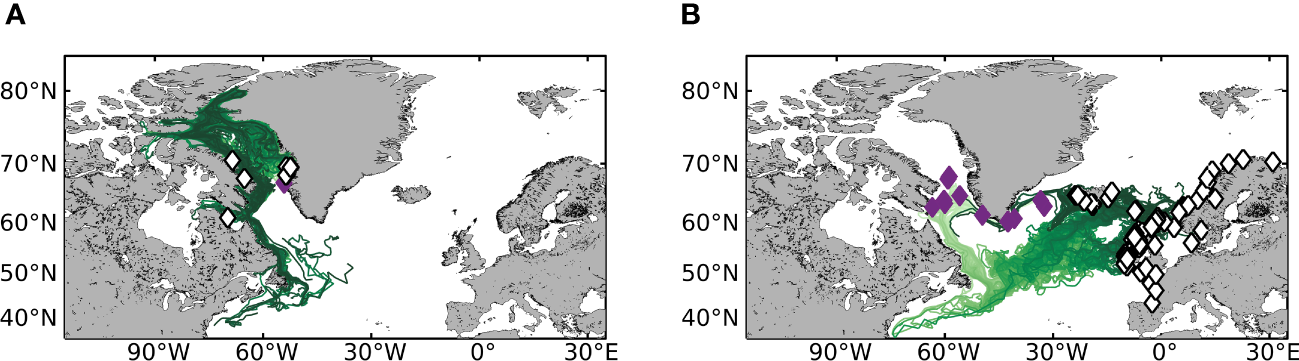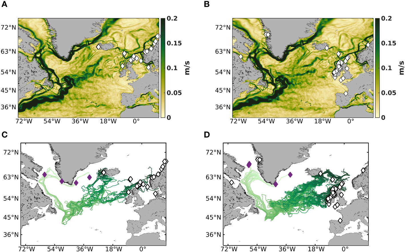 Virtual particles deployed south of Davis Strait, western Baffin Bay, or south of Greenland, tend to travel counterclockwise around the North Atlantic (Figure 6B), and drift eastwards over to Europe. Particles taking this route, enter the outer Labrador Current and drift into the NAC. In general, we find that the virtual particles follow the main ocean currents, and thus their trajectories have the potential to be impacted by the large scale ocean circulation and changes within.
