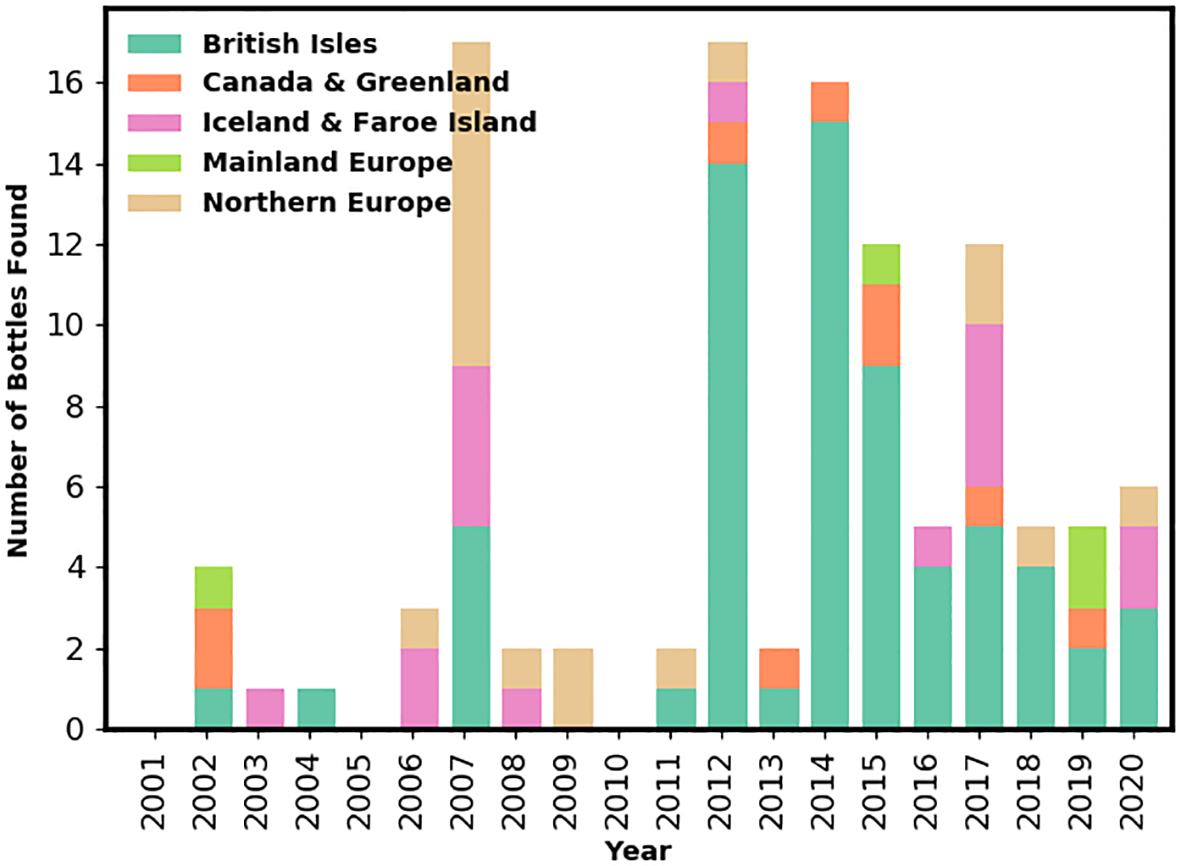 Bottles recovered from 2001 to 2020, separated into five regions; British Isles (UK, Scotland, Ireland, Northern Ireland), Canadian Arctic and Greenland, Iceland and the Faroe Islands, Mainland Europe (bottles found on the coasts of France and Spain), and Northern Europe (Norway, Sweden, Denmark).