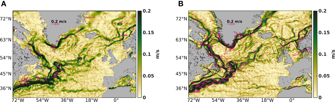 Mean geostrophic velocities for the years 2004-2008 for (A) GlobCurrent satellite observations and (B) our ANHA12 model simulation. Speed of the geostrophic velocities are shown by the yellow to green shading, while velocity vectors are indicated by the pink arrows.