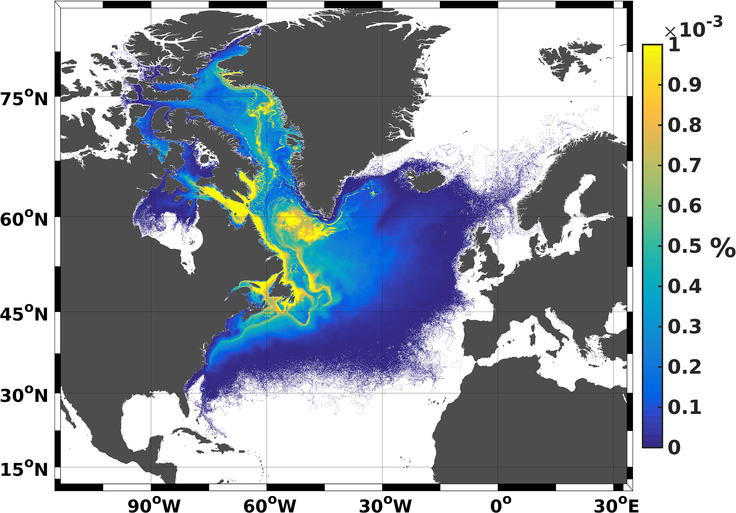 Using the Ariane particle data, we calculated the probability of a particle being present in a coastal grid cell (within ∼5 km; Figure 4). Low probabilities are noted around Iceland, the British Isles, the Faroe Islands, Azores, and Madeira. On the other hand, relatively high probabilities (>0.5%) are located along the east coast of Canada, the eastern Canadian Arctic, and the west coast of Greenland.