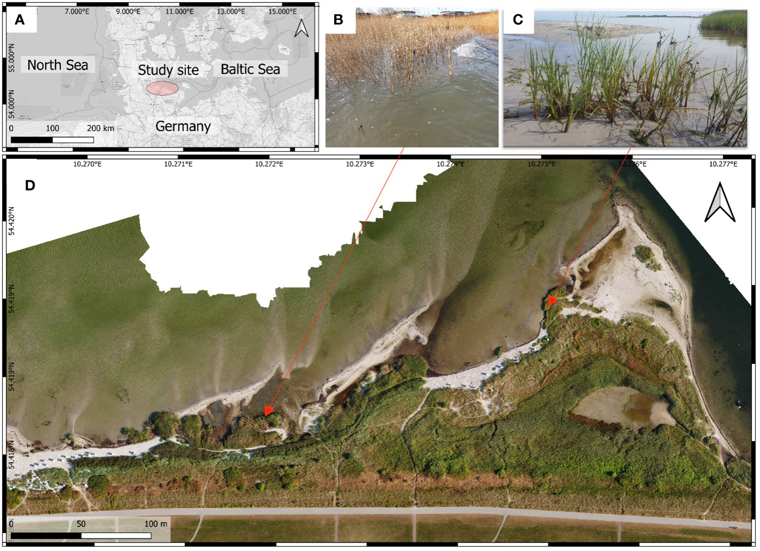 The case study site, Stein, is situated in northern Germany in the outer Kiel Fjord, Baltic Sea (A) Background map: Open Street Map). Coastal vegetation in the area is diverse, but the wetland edge is dominated by Phragmites australis (B) with a few patches of Bolboschoenus maritimus (C). Transitions from wet habitats to sandy habitats covered by dune vegetation occur over a few meters. Accommodation space is limited by a dike. The orthophoto was generated in August 2022 (D). The workflow presented in this study can be adopted to any other site, and Stein Beach was used as a case study site to setup and test the blueprint.