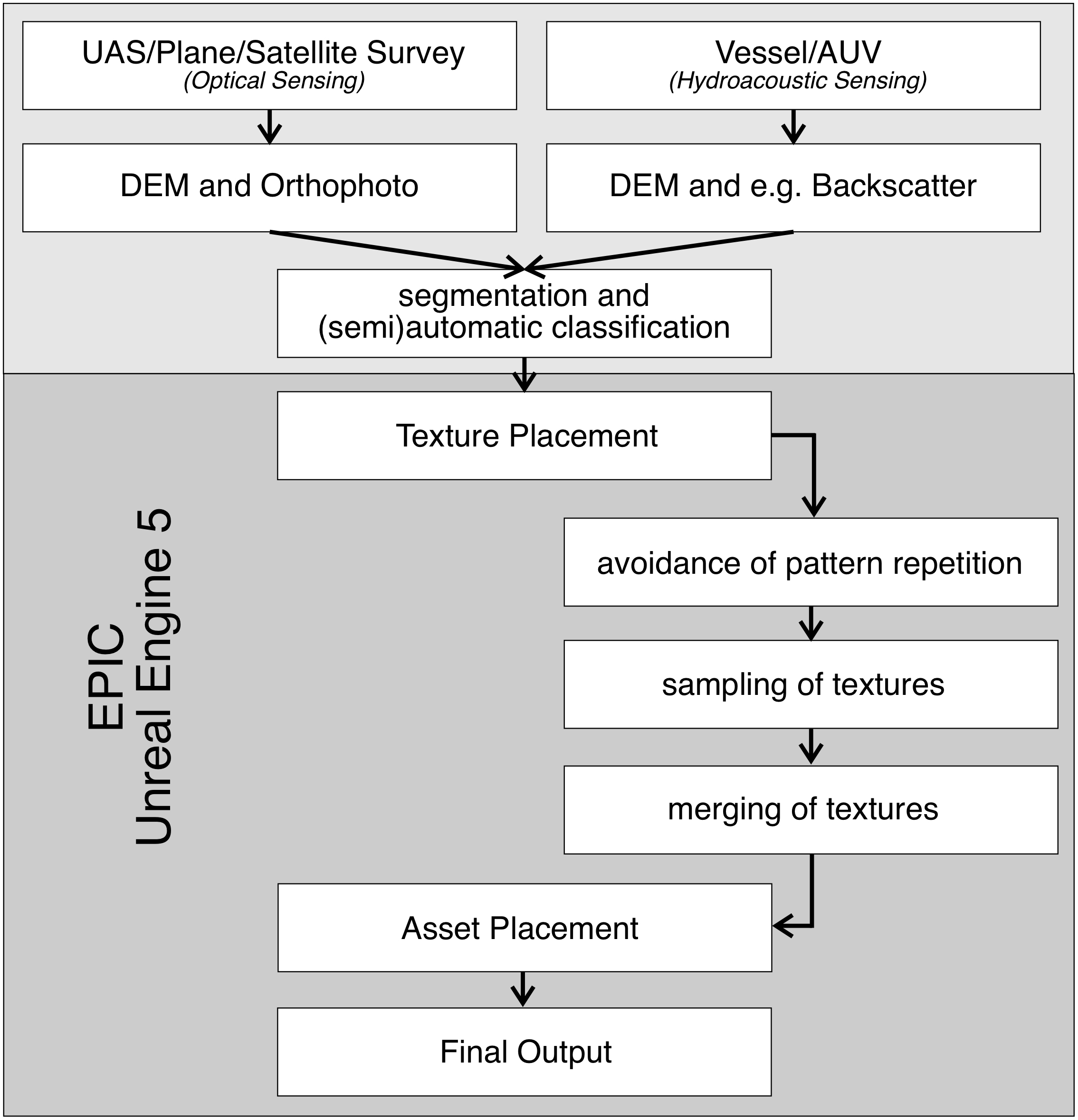 Workflow and pipeline to visualize optical- and acoustic remote sensing data in asset-based virtual environments. The input data consist of a DEM and classification/segmentation maps. Whether these data were generated by optical sensing or (hydro-)acoustic sensors is not important. The data pipeline starts with the final segmentation/classification product and transforms these data into virtual environments within the Game Engine EPIC Unreal Engine 5.