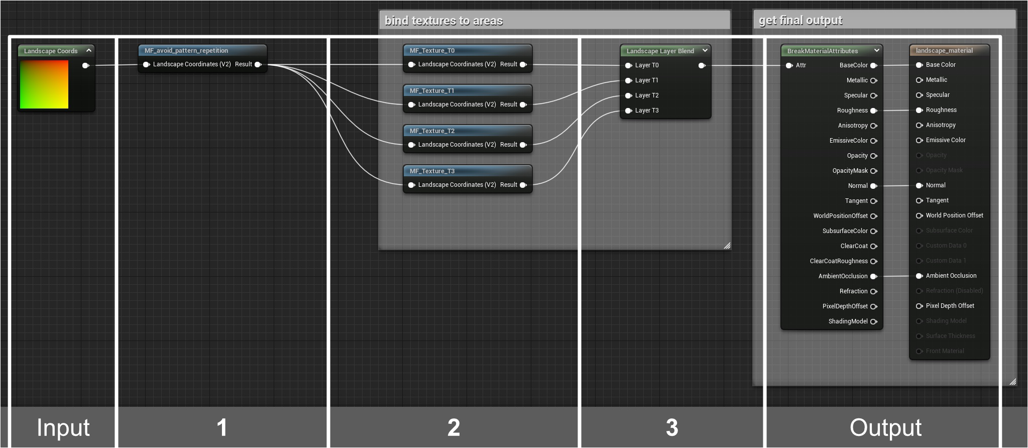 Example of a landscape material showing the input node (LandscapeCoords) and the output. The input involves four steps: (1) Avoid pattern repetition, (2) Texture sample, (3) Texture merging, and final output. The output includes automated asset placement. See the statement on Data Availability for a link to the entire Epic Unreal Engine 5 Blueprint.