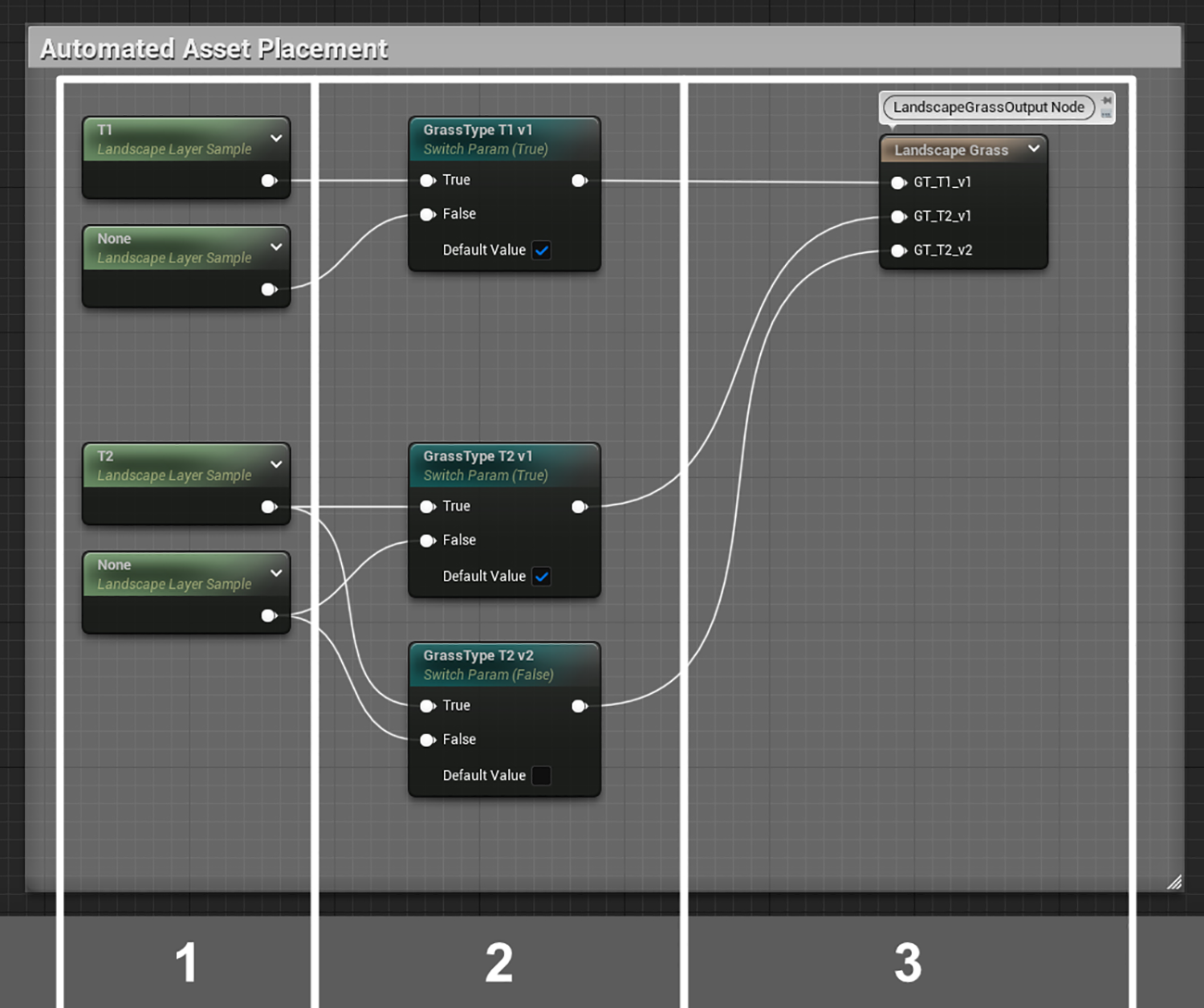 In the first step of the automated asset placement, which is part of the UE5 landscape material blueprint (Figure 5), the landscape layers are selected by referencing the name given during texture placement. In some cases, it could be important to place different assets within the same landscape layer; such as when a specific plant type should be visualized in different phases of life or in different health conditions. Simultaneously displaying these different assets would not lead to a realistic visualization, and so the landscape material needs to be capable of spawning different assets for the same landscape layer. This is realized in step two of the extension of the UE5 blueprint (Figure 5) by defining parameters that can be accessed and adjusted within instances of the landscape material. This means that vegetation types or stages can be modified during model runtime. In step 3, each asset type (GrassType object) is selected and mapped to the corresponding landscape layer.