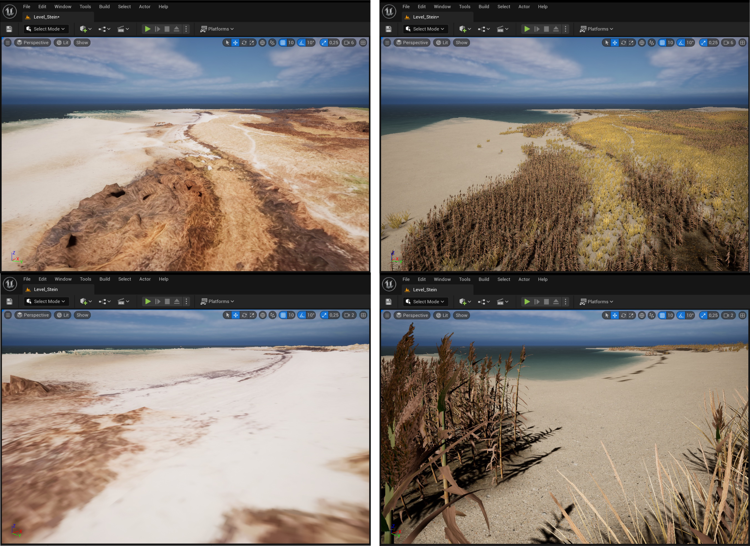 Remote sensing results, such as photogrammetry data from UAS RGB camera surveys or LIDAR data, can be quickly translated into immersive experiences for a variety of landscapes (e.g. Reinoso-Gordo et al., 2020; Rienow et al., 2020; Huang et al., 2021). A virtual environment is thus a powerful tool for visualizing and discussing localized scenarios with different stakeholders, which is particularly important in the dynamic and ever-changing coastal zone. Our asset-based approach allows us to create immersive virtual environments that can easily be modified into different coastscapes. Asset choices are large and often available for free or at low cost (e.g. www.unrealengine.com/marketplace; https://quixel.com/megascans/); yet, whenever a particular asset cannot be externally sourced (e.g. rare plant species, or special textures of rock and sediments), the work flow to create it is more labor-intensive compared to automated photogrammetry, and requires 3D modeling and texturing skills.