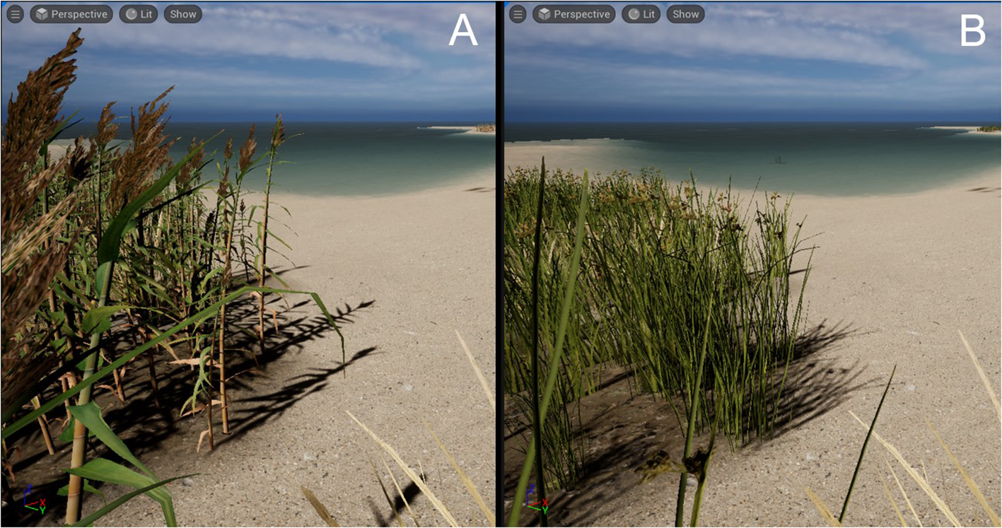 Visualization of the wetland edge dominated by (A) Phragmites australis, and (B) Bolboschoenus maritimus. Asset-based virtual environments enable visualization and communication of potential environmental changes, both for decision-makers and the general public.