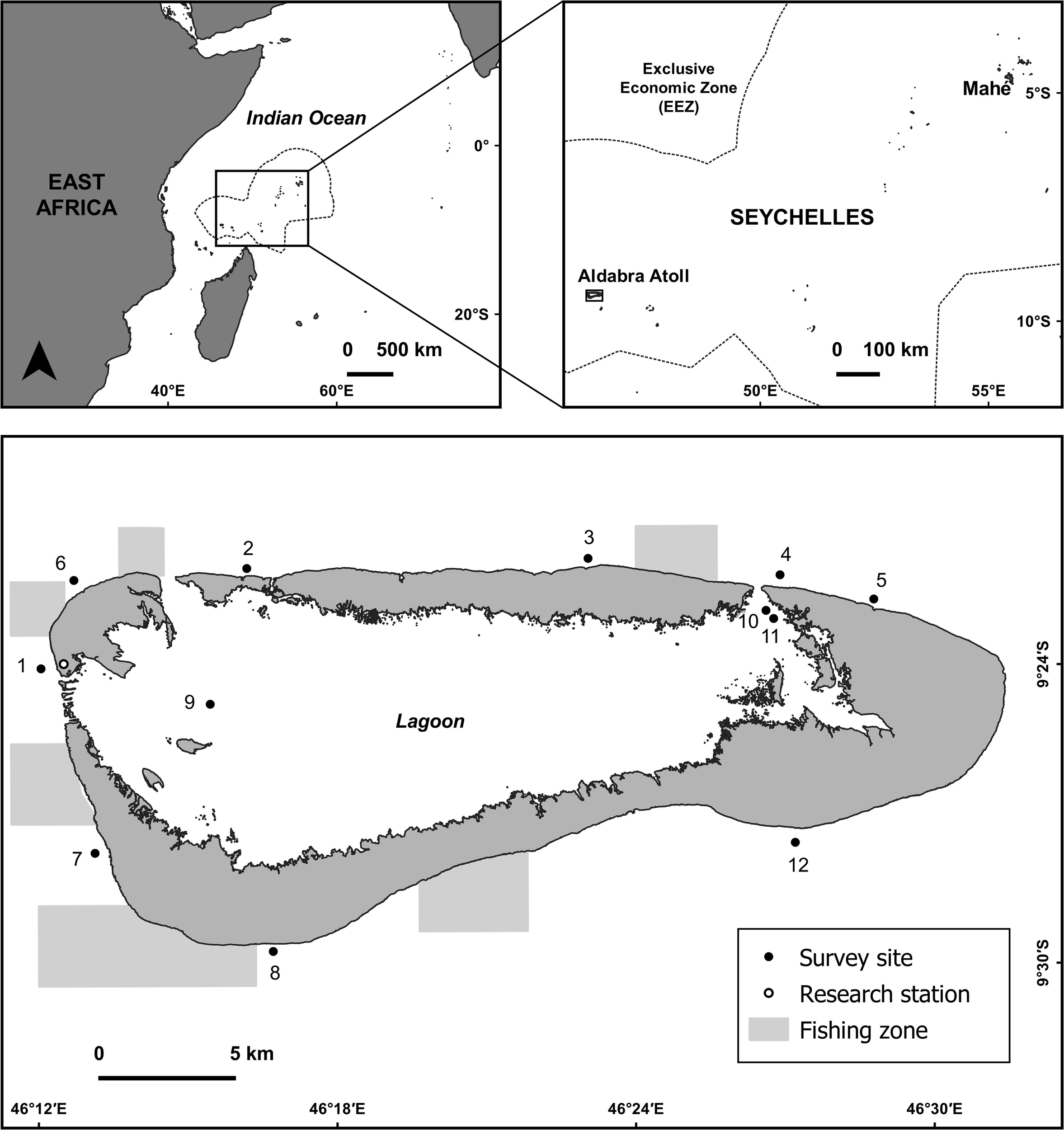 Location of Aldabra Atoll in the Indian Ocean and within Seychelles, with its four main islands and 12 marine survey sites. Sites 1–8 and 12 are outside the lagoon on the seaward reefs, with permanently marked transects at both 5 and 15 m water depth, while sites 9–11 are inside the lagoon, with permanently marked transects at 2–3 m water depth. Grey polygons on the seaward reefs demark zones within which SIF permits handline bottom fishing of its subsistence fishery (trolling of pelagic fish is allowed outside these zones but not inside the lagoon). Figure modified after Koester et al., (2021) and included under a CC BY license, with permission from the Seychelles Islands Foundation (copyright 2021).